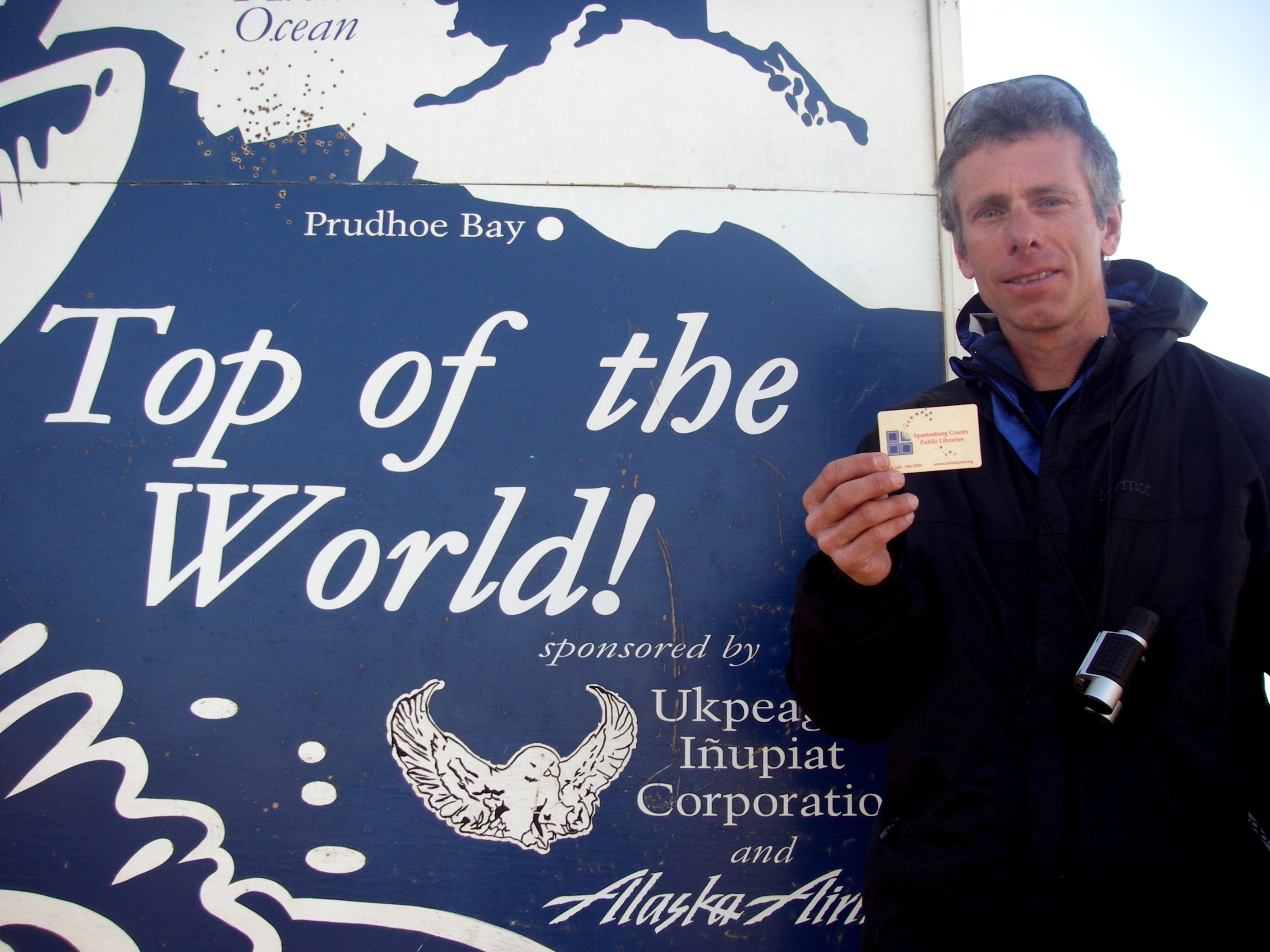 Rob Wilder with his Spartanburg County library card in front of the "Top of the World" sign in Barrow, Alaska. Rob's home town library post photos of people on vacation that show them holding their library card.