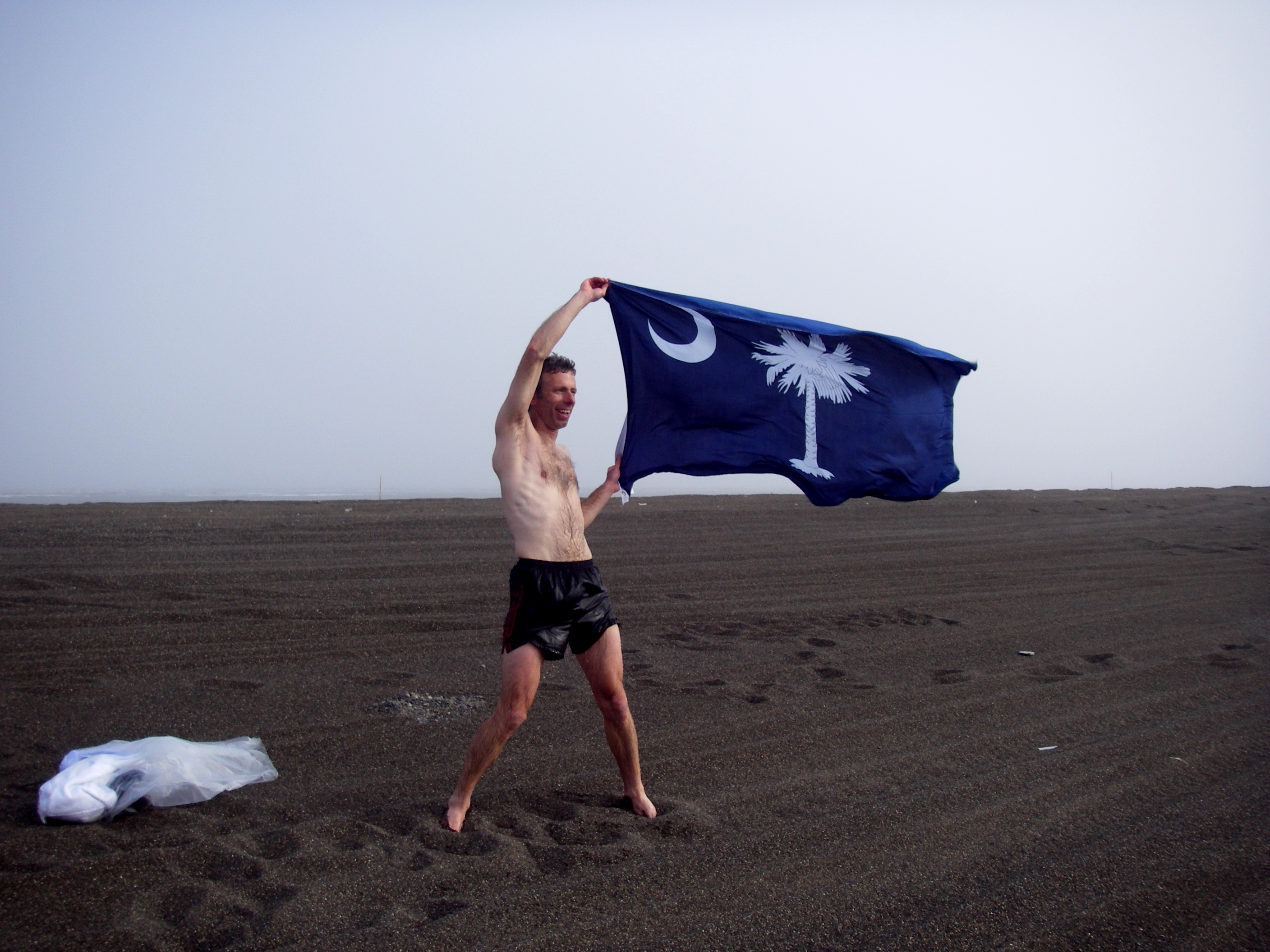 Rob Wilder after his polar bear swim at a beach near Point Barrow. He wanted to show everyone where he was from, so he held the South Carolina flag up in a stiff 25 mph wind. The water and air temperatures were both about 37° F, making for a cold and short swim.