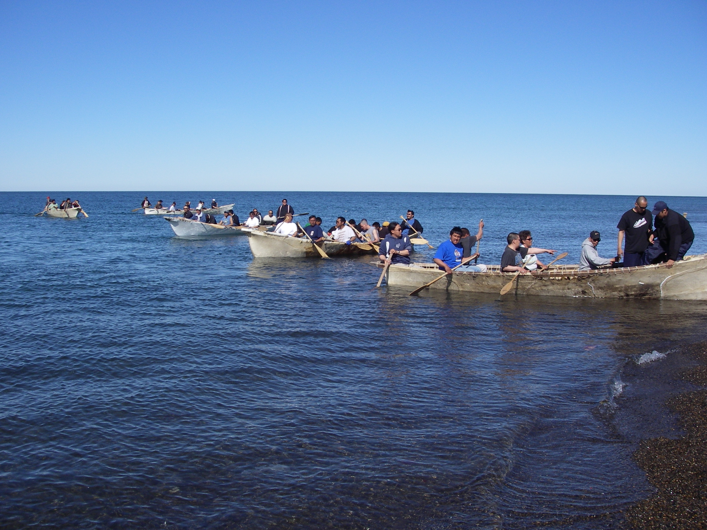As part of the July 4th celebration, the whaling teams have skin boat races. Skin boats are the traditional whaling boats made of bearded seal skins. They are used during the spring whaling season. This photo shows the teams preparing for the beginning of the race, near the beach in Barrow, Alaska.