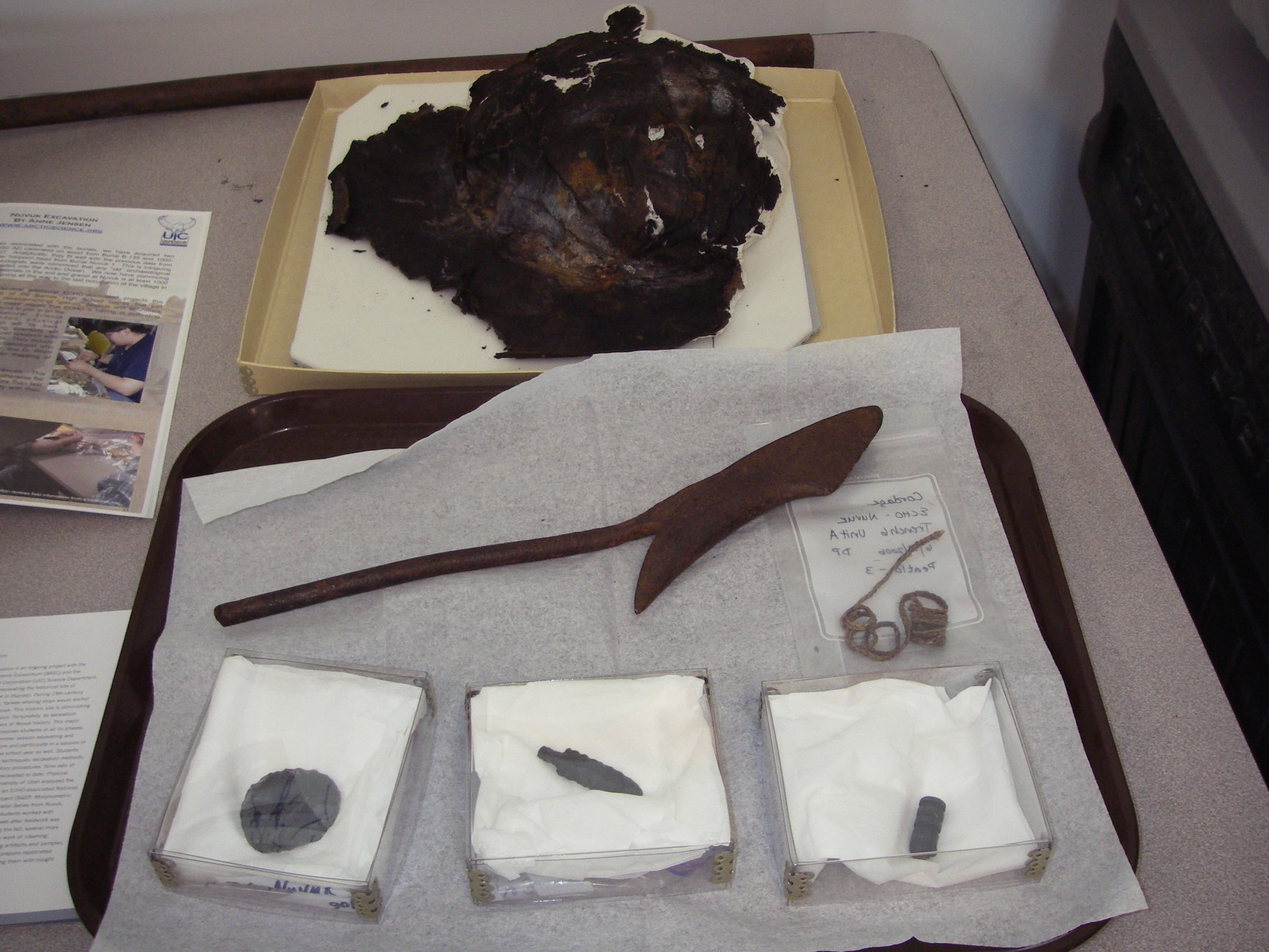 This photo was taken in the new BASC facility in the archaeology room. It shows some of the artifacts that have been collected at Point Barrow. There is a metal harpoon tip and a "Yankee" whaling cap along with other artifacts.