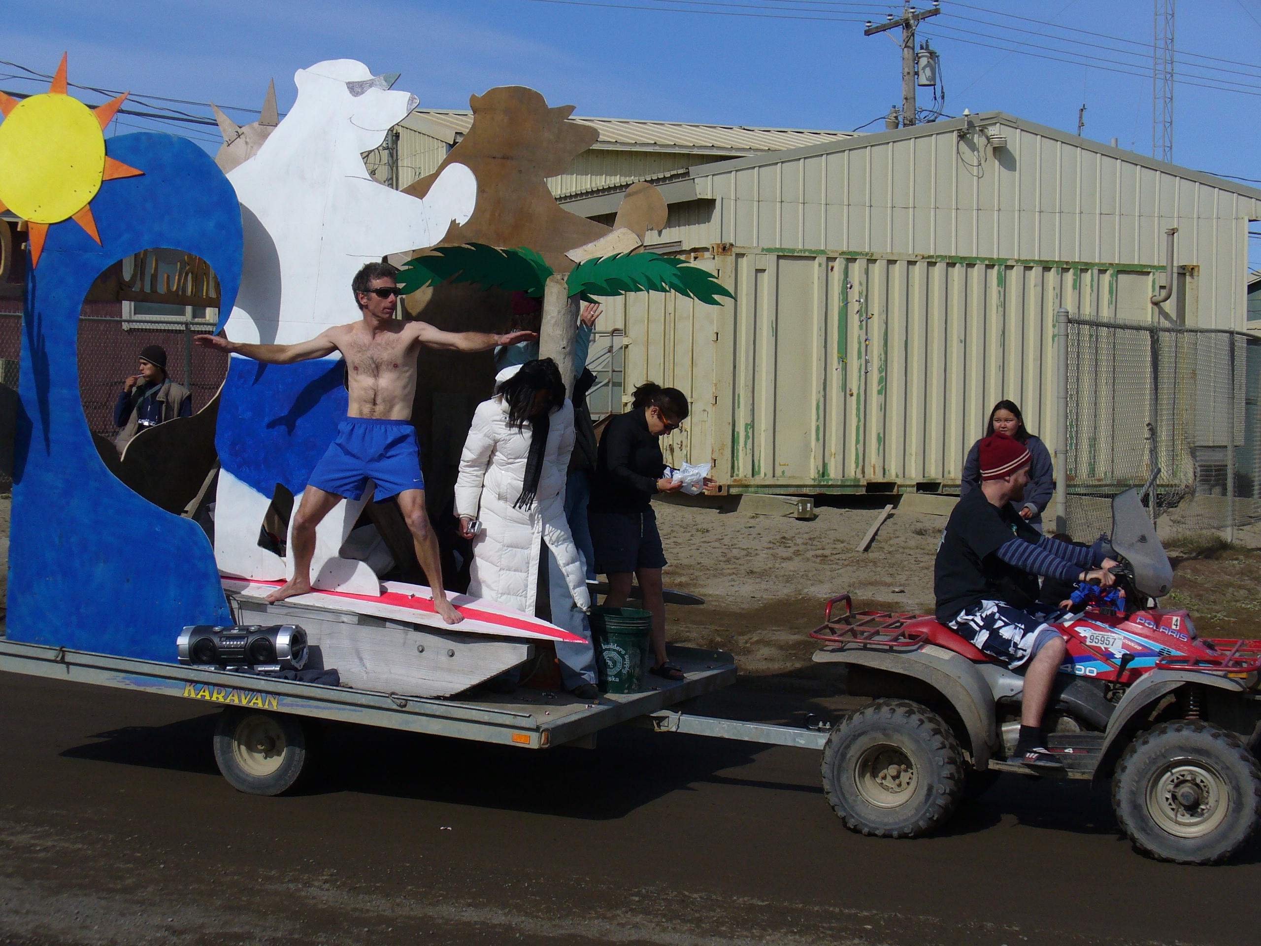 Another photo of the BASC float in the July 4th parade in Barrow, Alaska. Rob Wilder is "riding the wave" on one of the two surf boards on the BASC float.