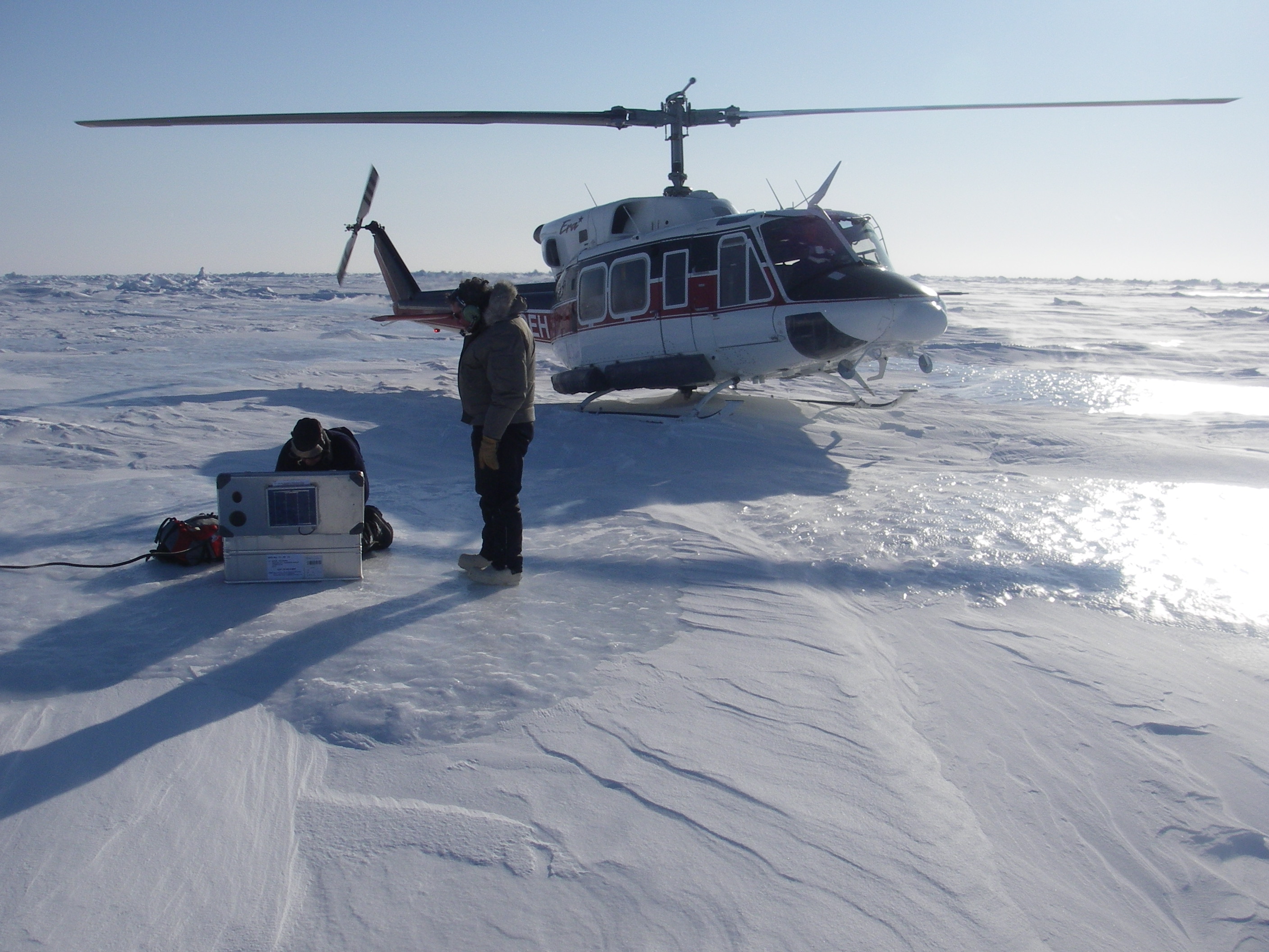 Lambert, the helicopter pilot, and Jeremy Wilkenson set up a remote positioning GPS buoy. At the SEDNA/APLIS Ice Camp north of Prudhoe Bay, Alaska.