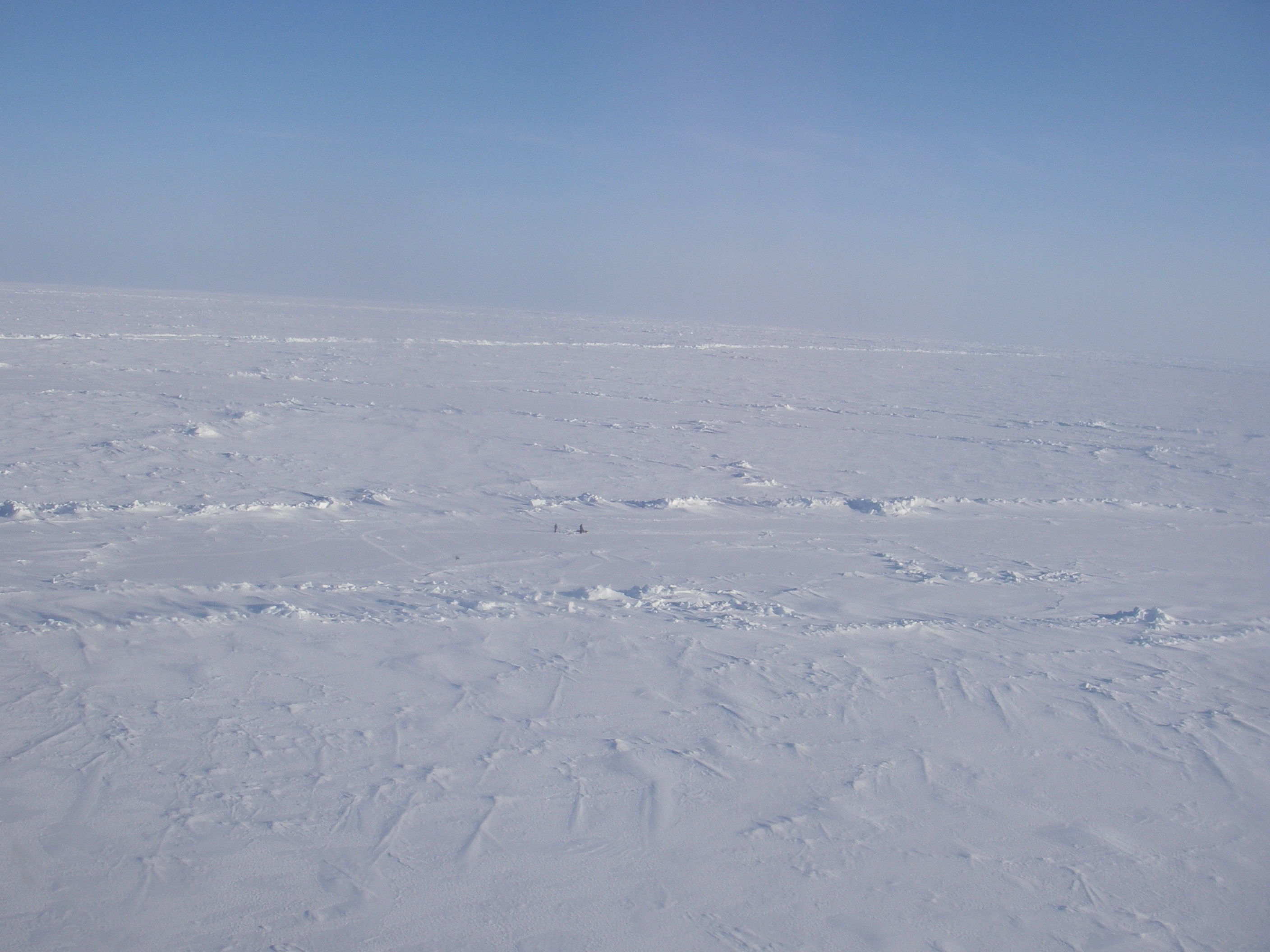 The ice survey team can be seen from the helicopter as two black specs in an ocean of ice. Near the SEDNA/APLIS Ice Camp north of Prudhoe Bay, Alaska.