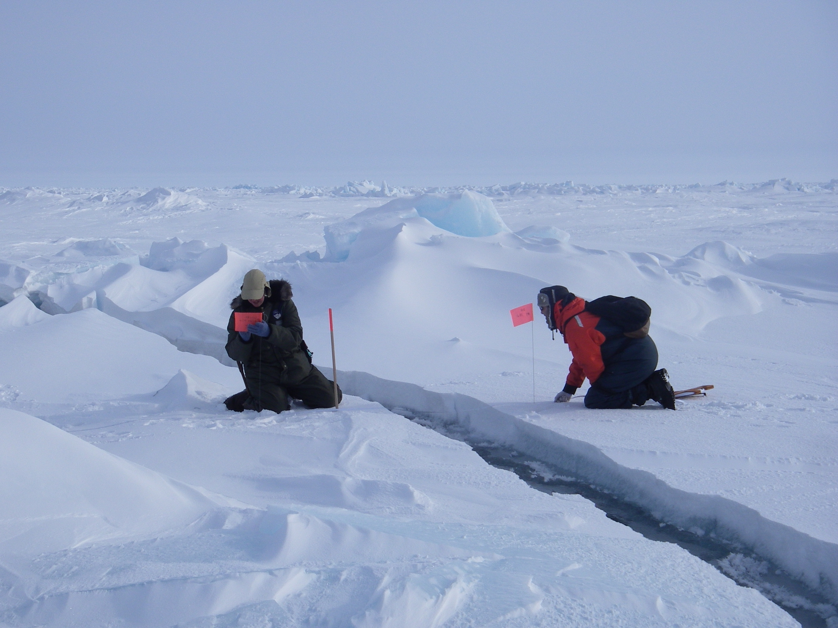 Cathy Geiger and Nick Hughes set up a station to measure the width of the lead. At the SEDNA/APLIS Ice Camp north of Prudhoe Bay, Alaska.