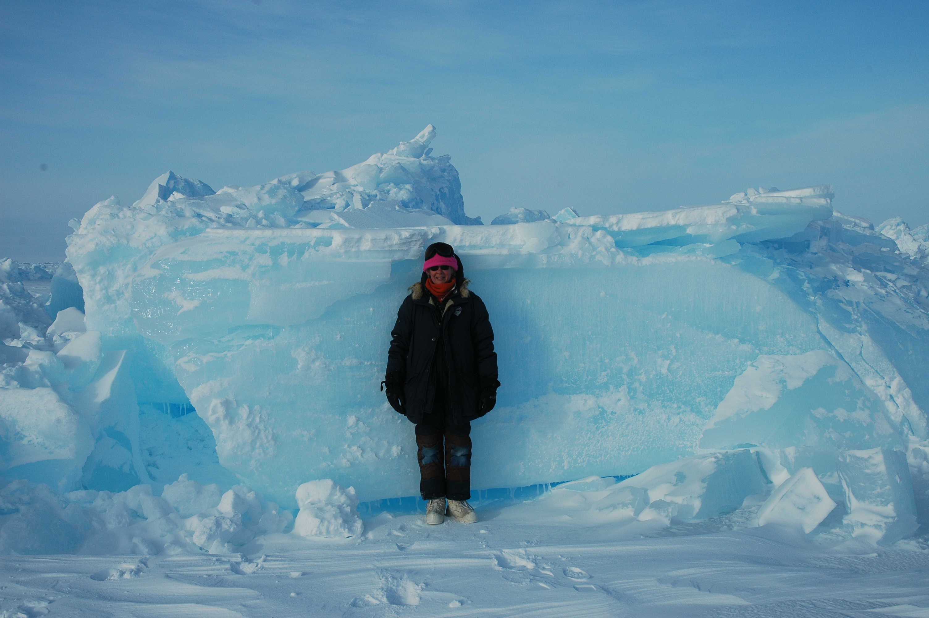 Jackie Richter-Menge stands in front of a block of multiyear ice. At the SEDNA/APLIS Ice Camp north of Prudhoe Bay, Alaska.