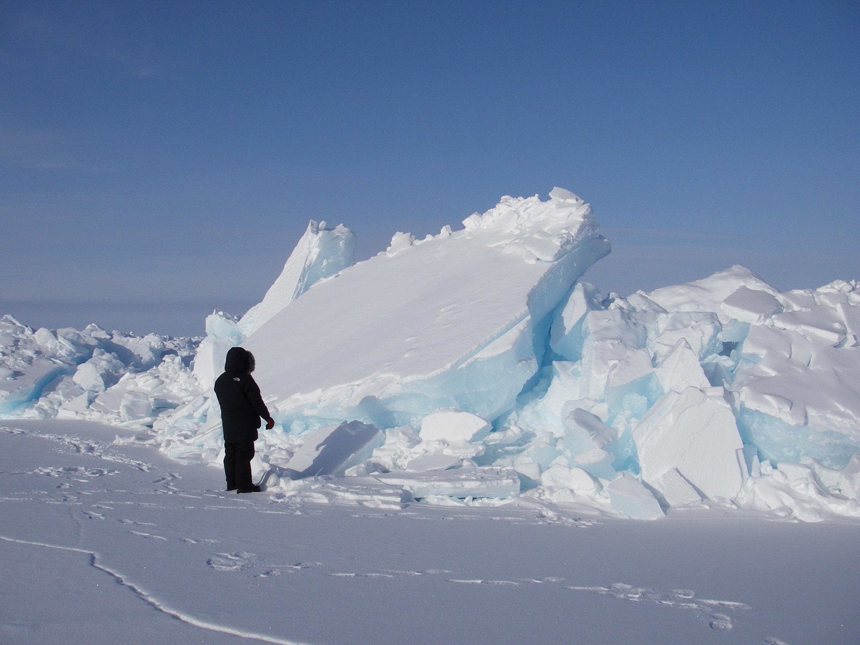 Katherine Giles examines some large ice blocks in a pressure ridge. At the SEDNA/APLIS Ice Camp north of Prudhoe Bay, Alaska.