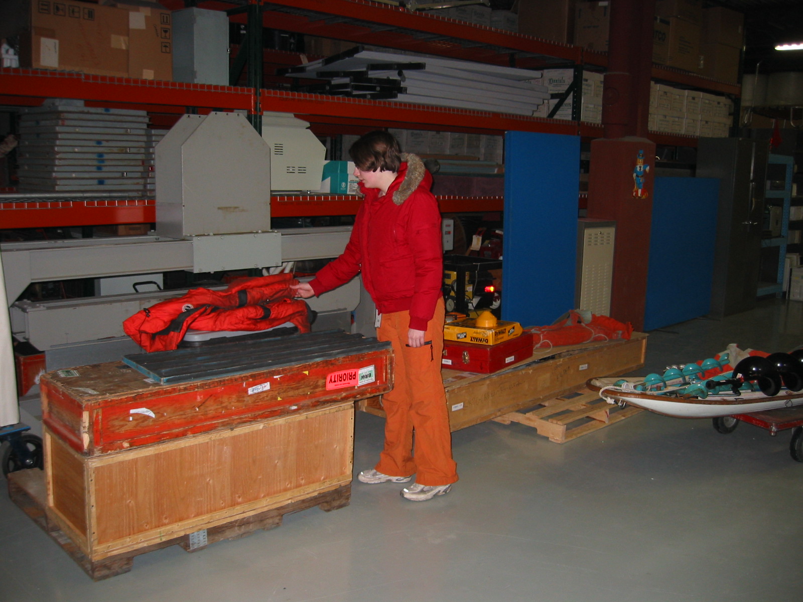 Dartmouth student Tess Mattraw selects CRREL gear for use at the SEDNA/APLIS Ice Camp. At CRREL (Cold Regions Research and Engineering Laboratory) in Hanover, New Hampshire.