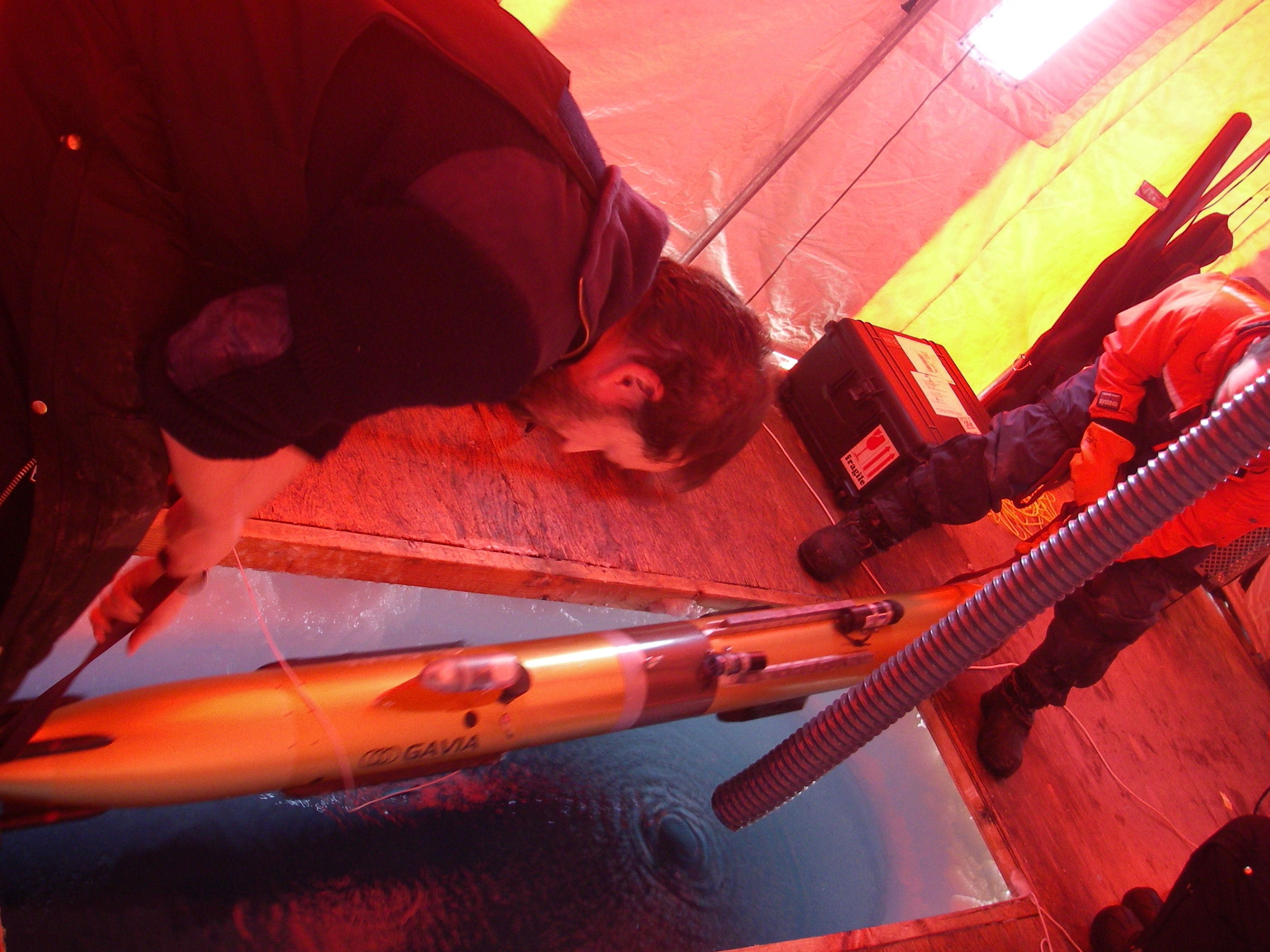 Dr. Richard Yeo positions GAVIA, the Autonomous Underwater Vehicle (AUV) over the dive hole prior to a mission. At the SEDNA/APLIS Ice Camp north of Prudhoe Bay, Alaska.