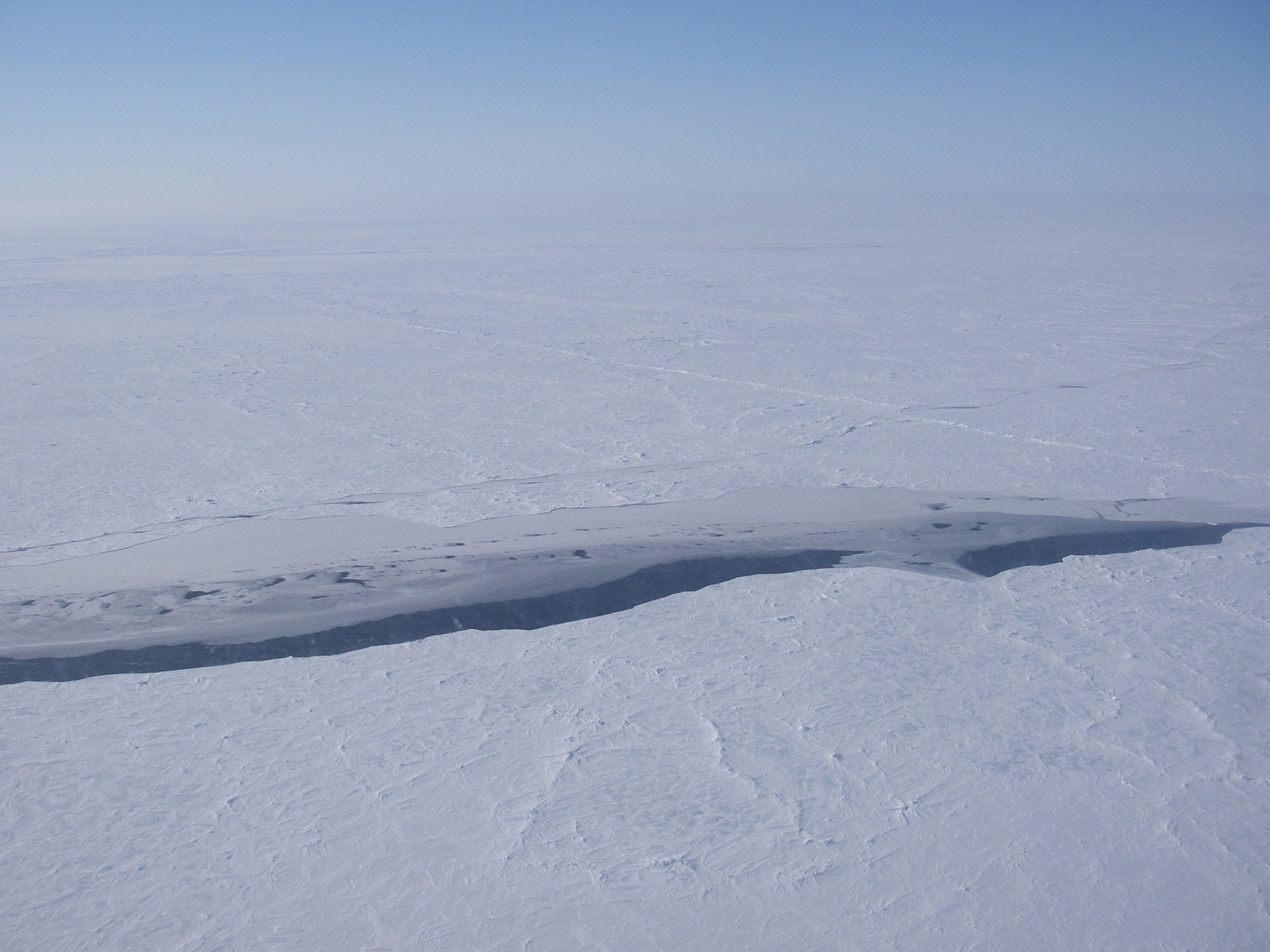 A large lead in thick sea ice, as seen from the helicopter. Near the SEDNA/APLIS Ice Camp north of Prudhoe Bay, Alaska.