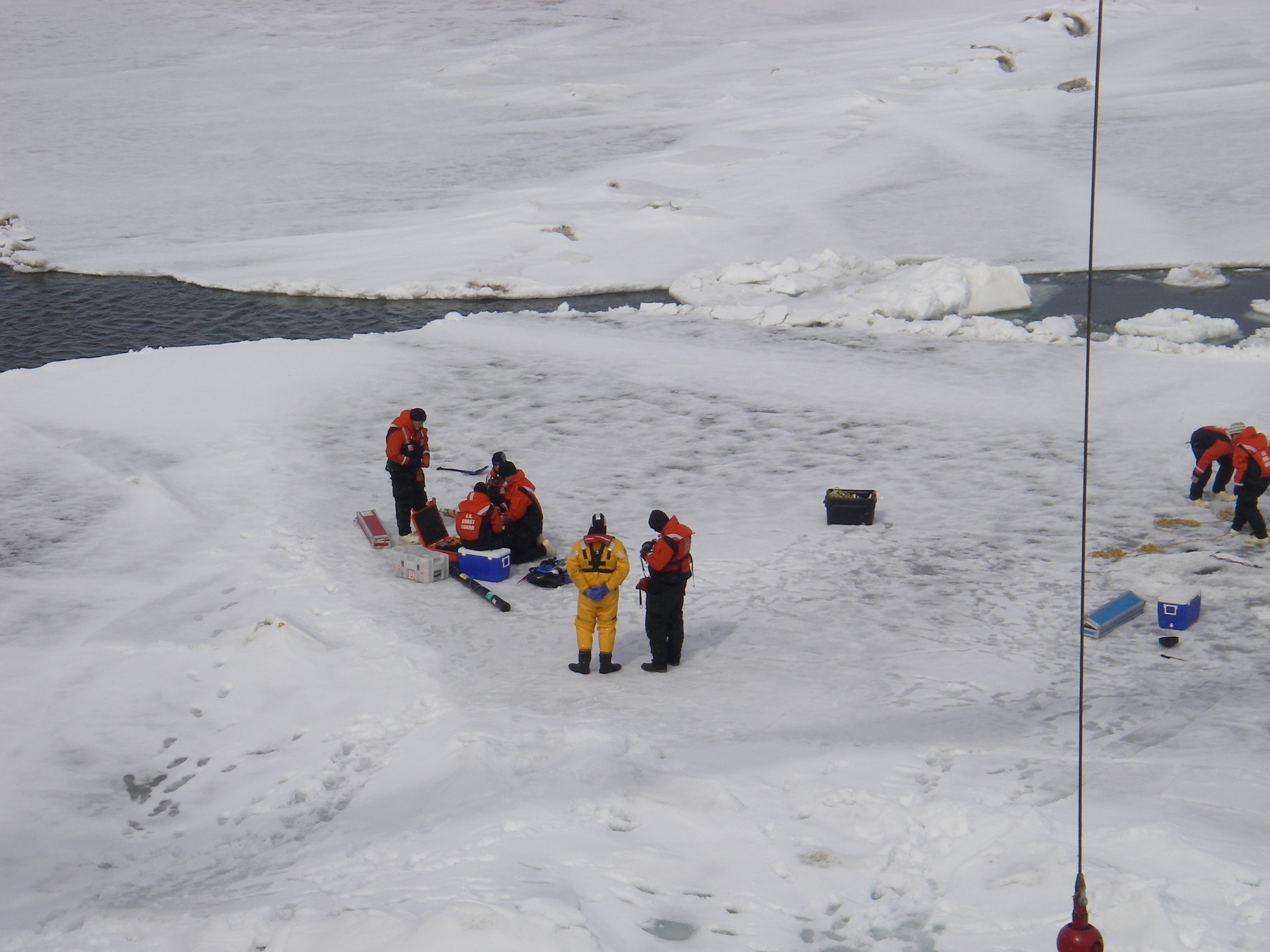 Several scientists work on the sea ice getting a core, as the Coast Guard safety swimmer watches nearby. From the USCGC Healy icebreaker, on the Bering Sea.