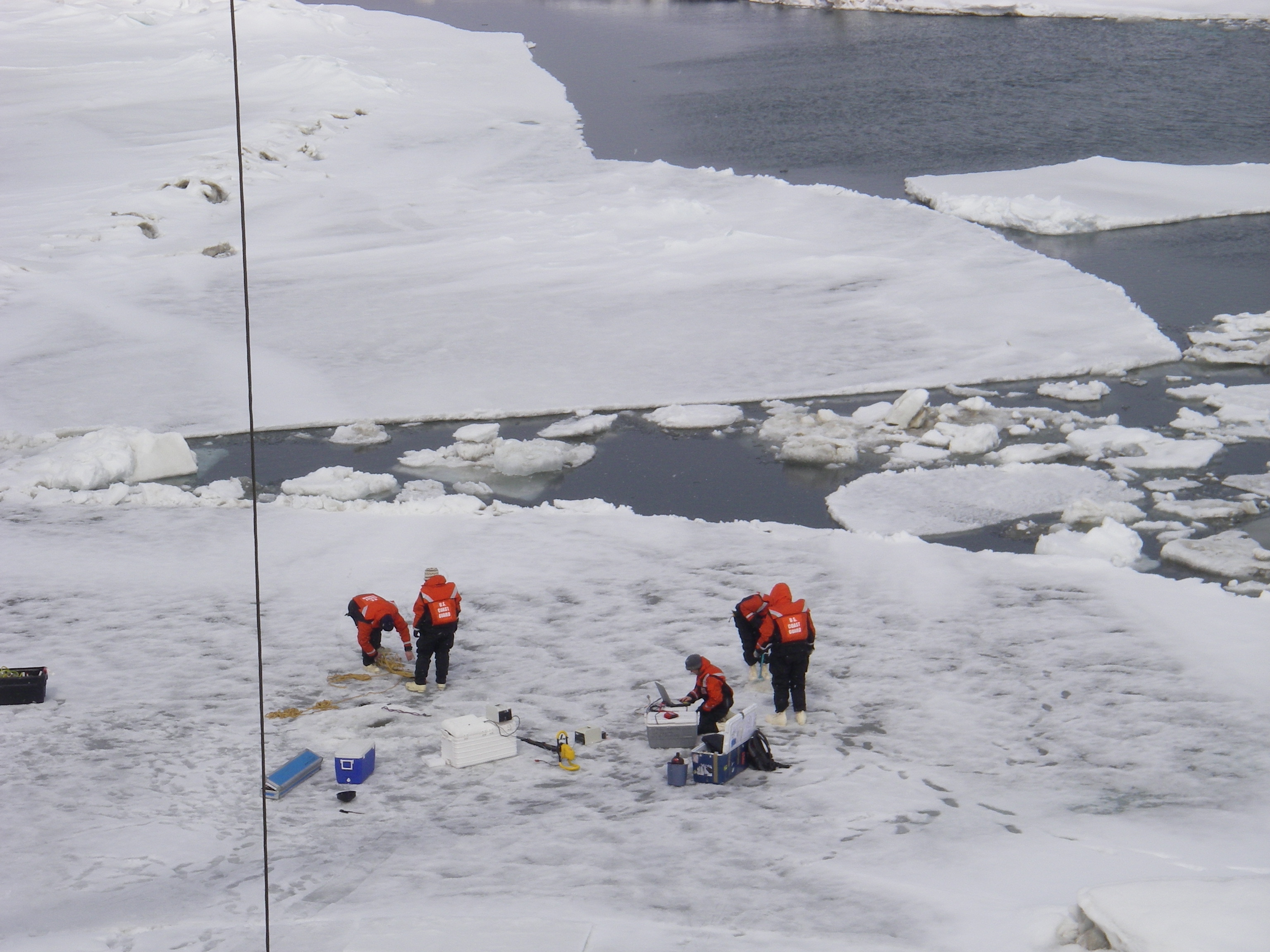 Out on the sea ice, scientists set-up the optode to measure oxygen levels and also get water samples from under the sea ice. From the USCGC Healy icebreaker, on the Bering Sea.