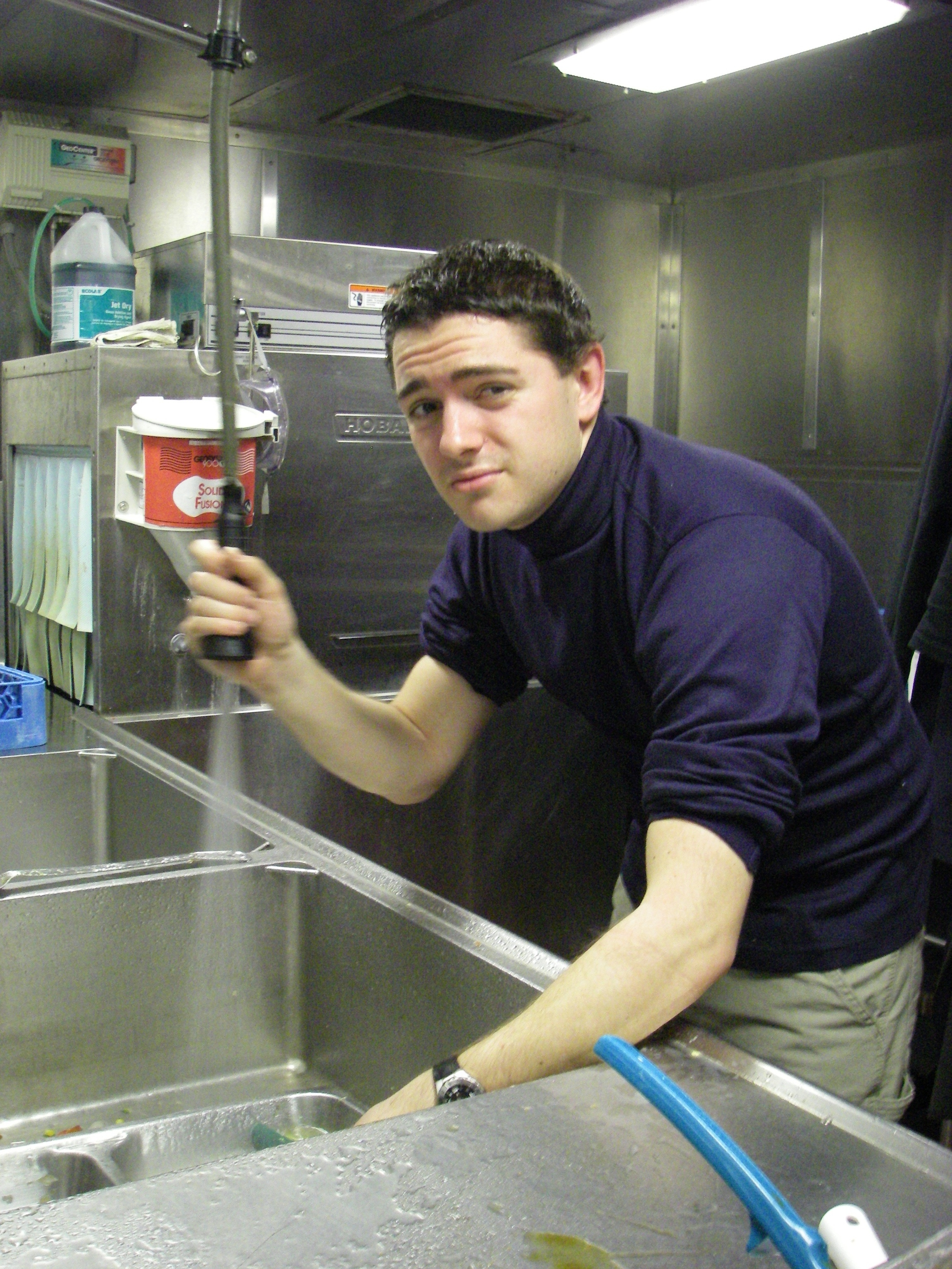 Kris Swenson works on getting the dishes clean. On the mess deck of the USCGC Healy icebreaker, on the Bering Sea.