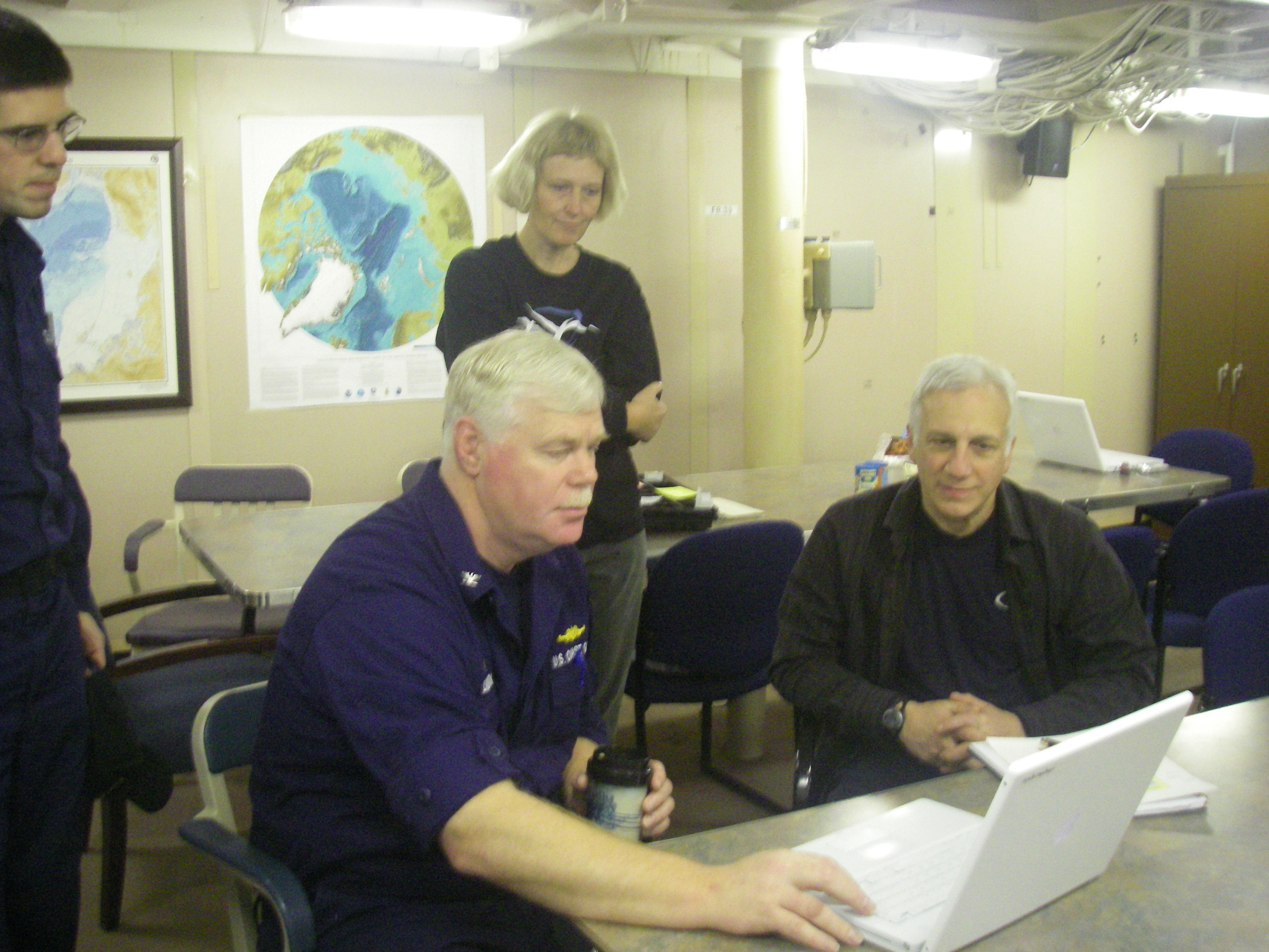 Captain Lindstrom, Ray Sambrotto, Maggie Prevenas, and Stephan Elliott look over the agenda and slides before the Live from IPY event. In the conference room on board the USCGC Healy icebreaker, on the Bering Sea.