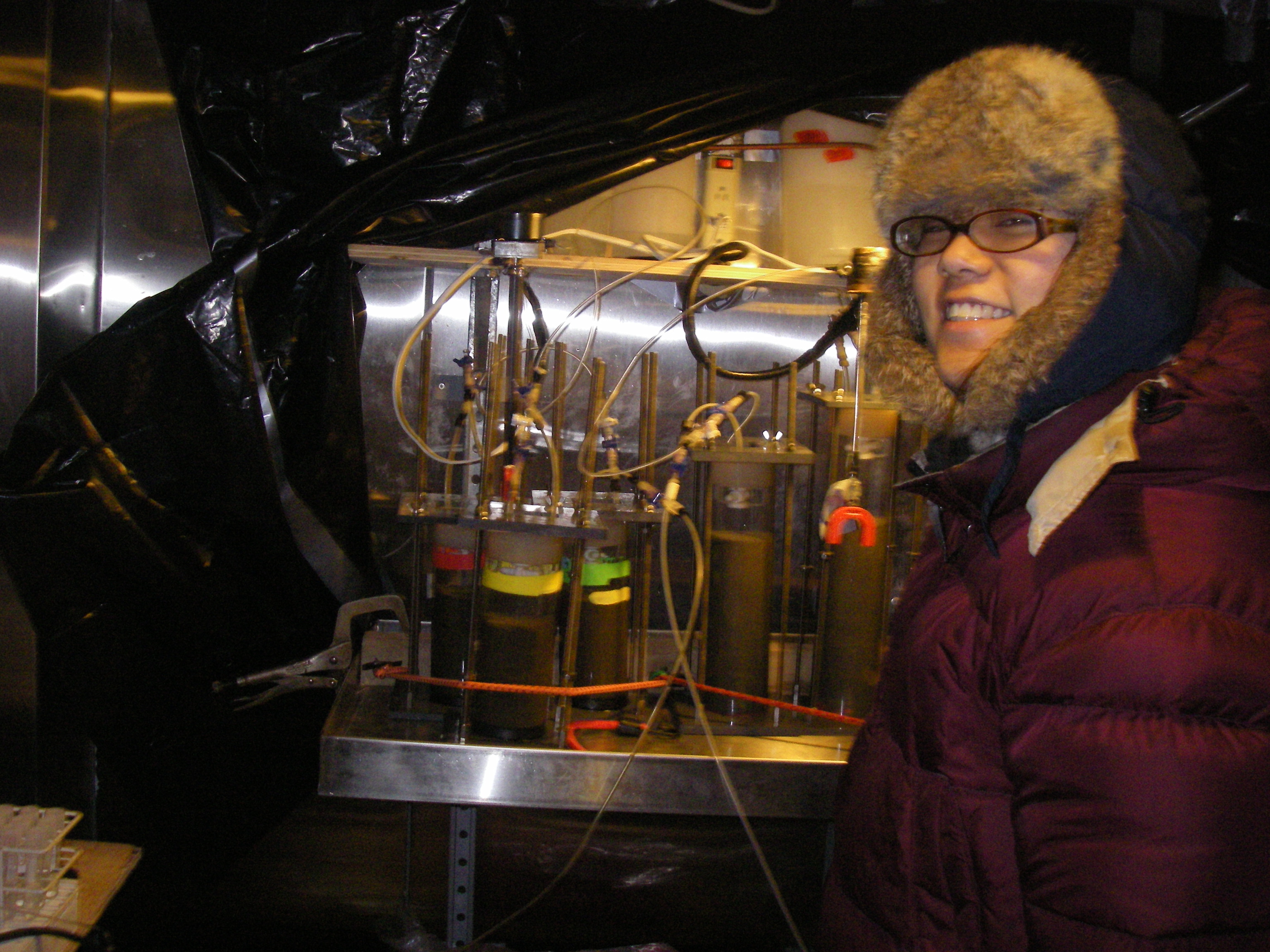 Bonnie Chang poses by her flux cores, as she begins to take measurements of the gases being produced and used by the microorganisms in the sediment. Inside the reefer room (walk-in freezer) on the USCGC Healy icebreaker, on the Bering Sea.