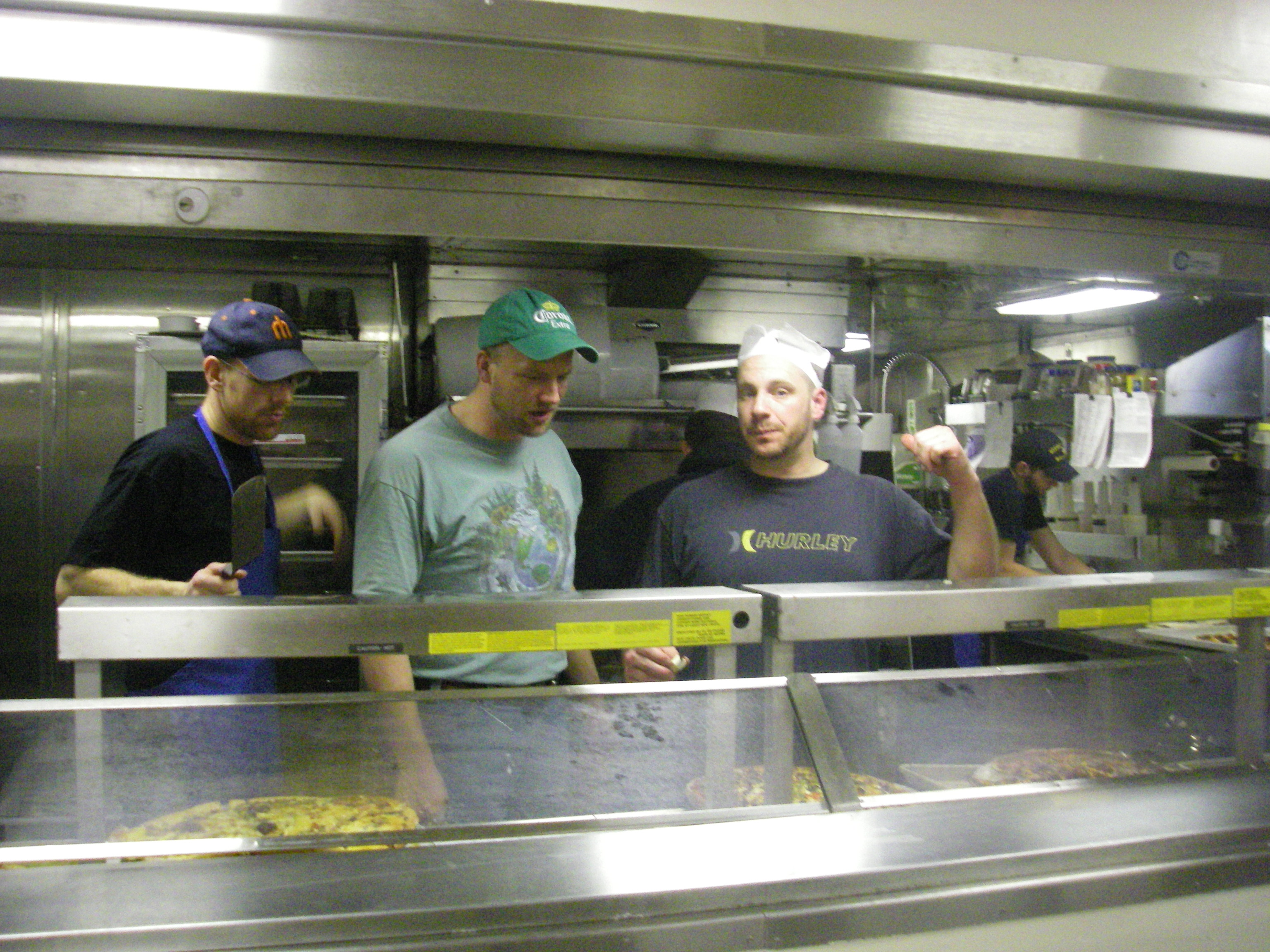 Several of the first officers serve up the pizza at dinner. On the mess deck of the USCGC Healy icebreaker, on the Bering Sea.