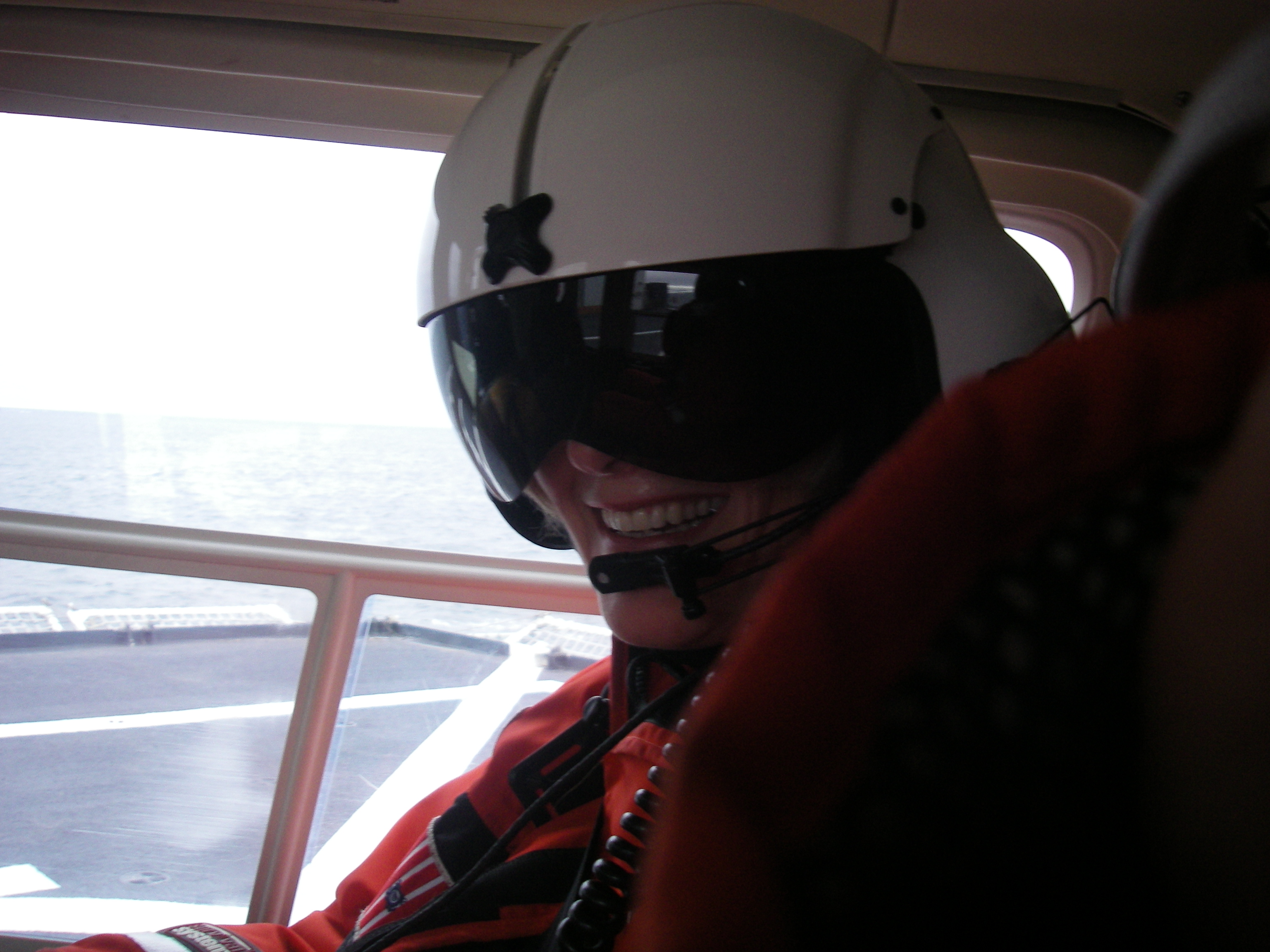 Maggie Prevenas is in the helicopter and is ready for the flight to St. Paul Island, Alaska.