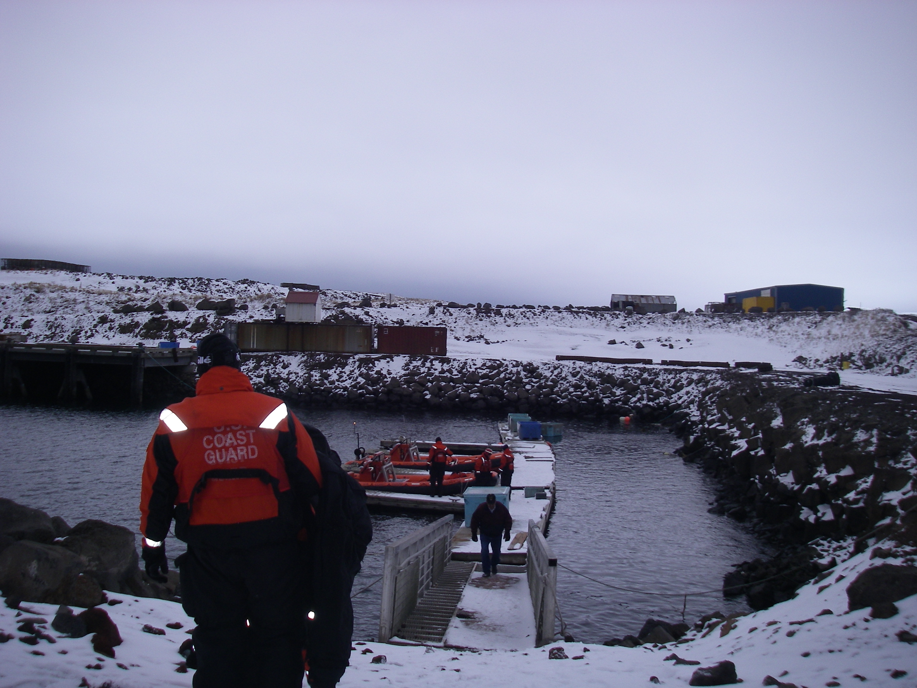 Everyone is off the zodiacs, and the Coast Guard crew collect the MS900 suits. In Zapadni Bay, in St. George, Alaska.