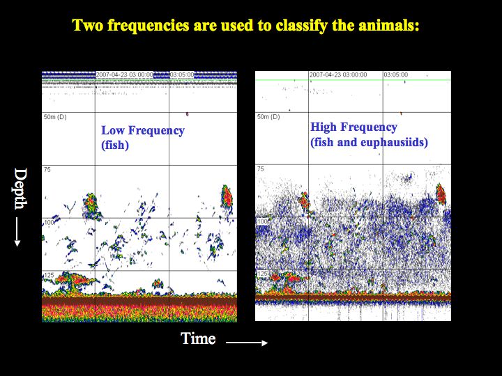 These are two echograms from the transducer showing the fish and plankton found by depth over time. On the USCGC Healy icebreaker, on the Bering Sea.