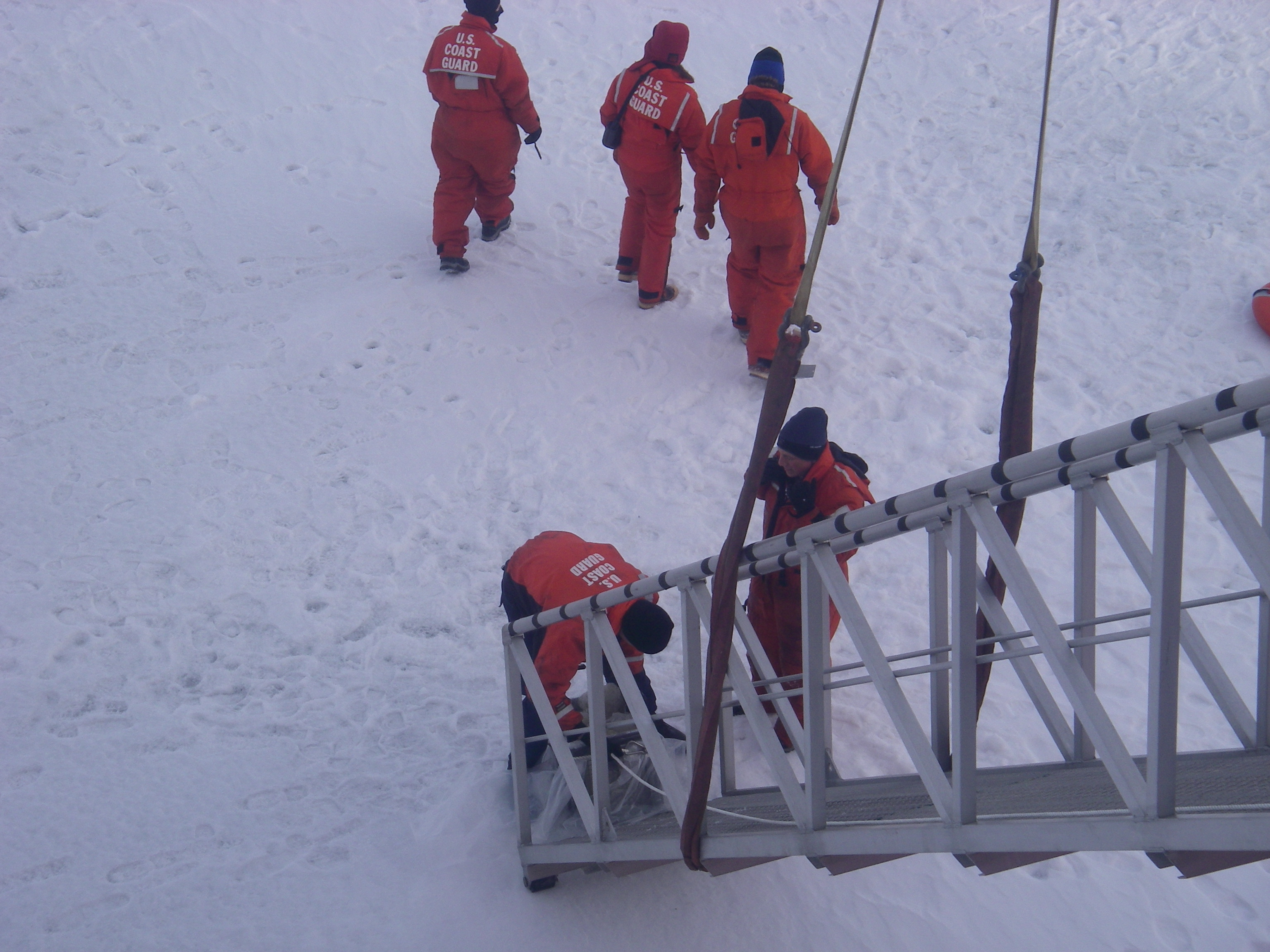 Sea ice being brought up the brow of the USCGC Healy icebreaker, to be taken to the lab for further tests. Out on the sea ice of the Bering Sea.