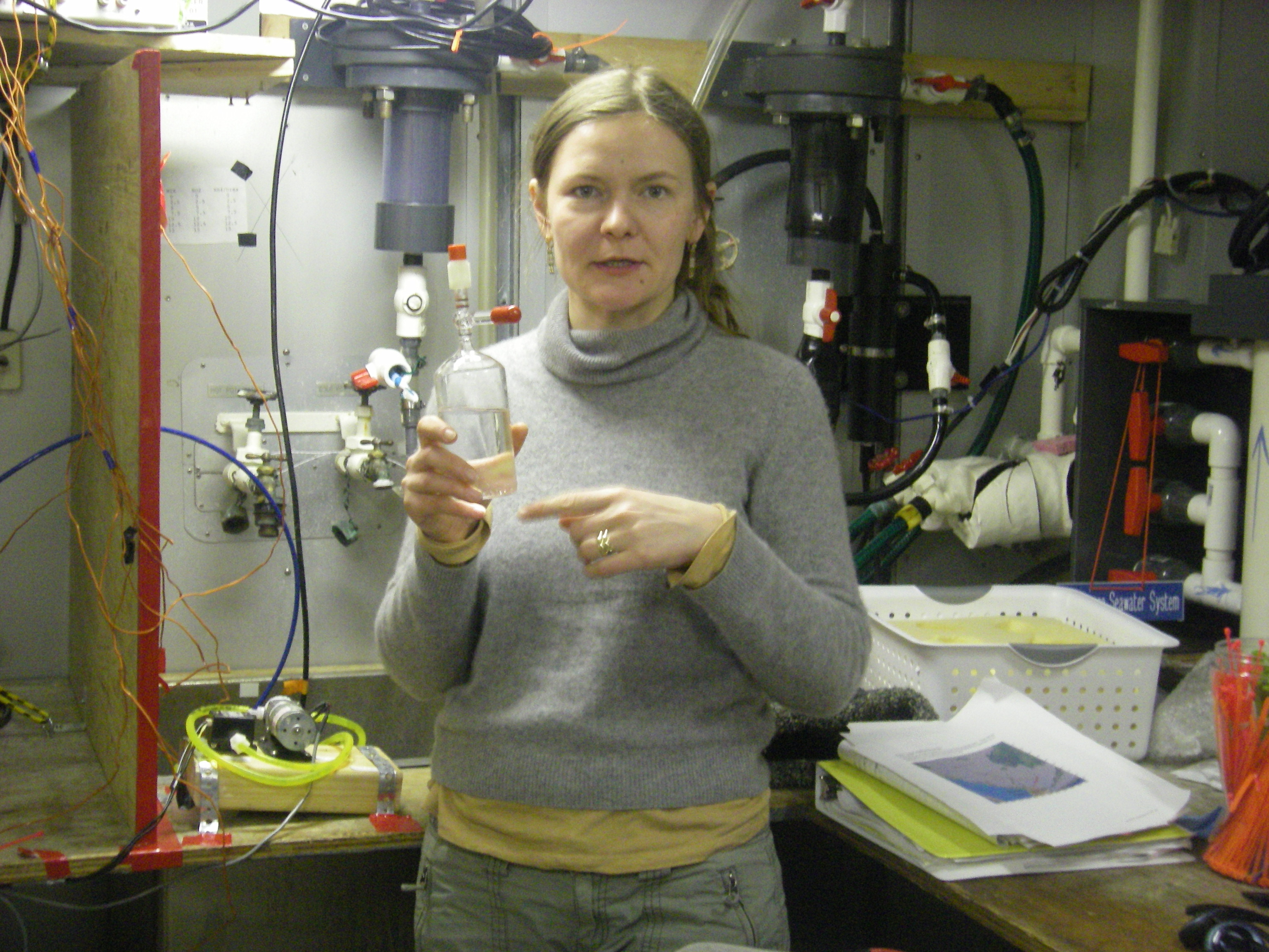 Masha explains the use of this uniquely devised bottle to get pure samples of water that have not been exposed to atmospheric air. In the science lab of the USCGC Healy icebreaker, on the Bering Sea.