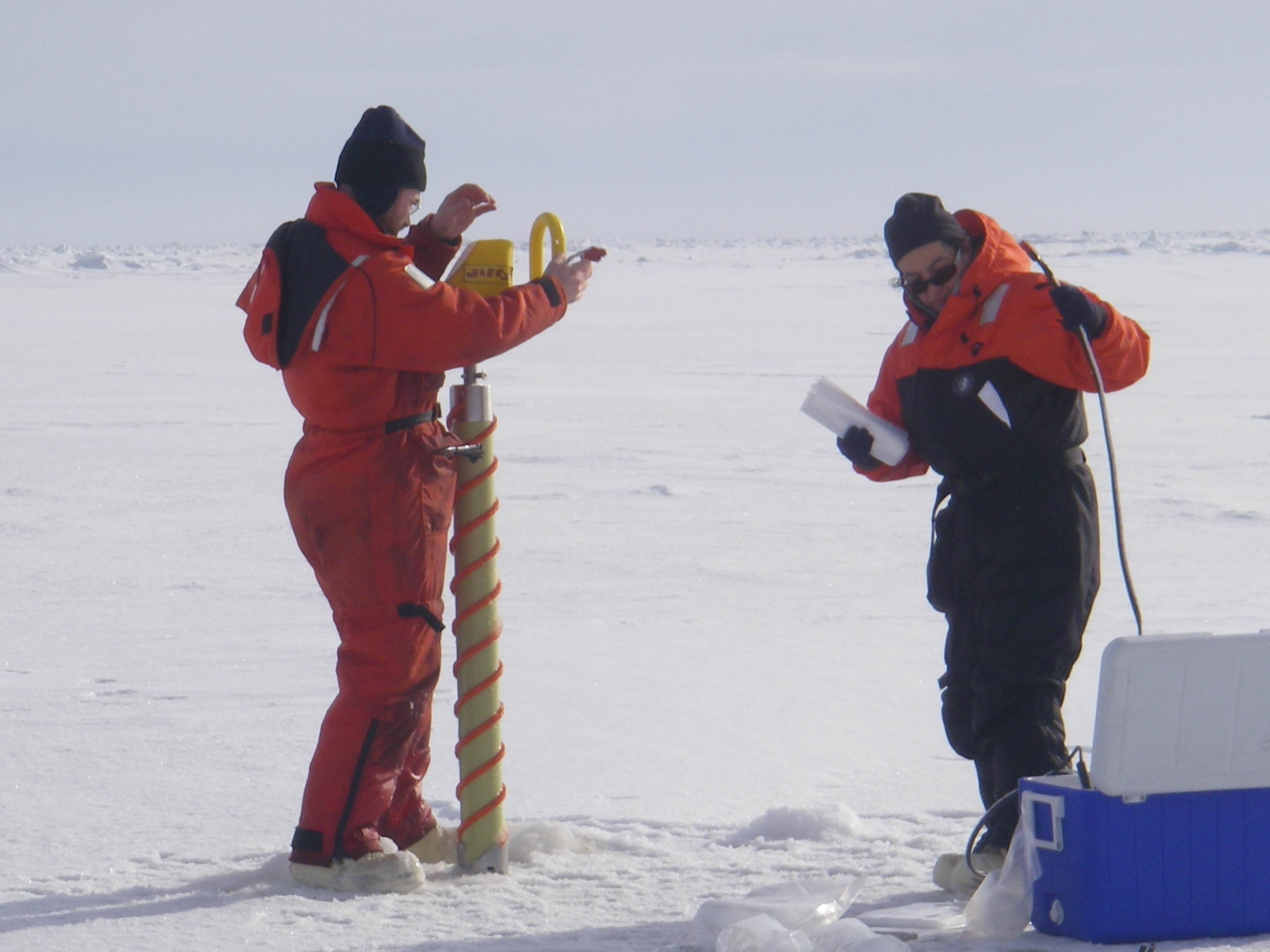 Rob Rember and Ana Aguilar-Islas working on drilling the sea ice holes. Out on the sea ice of the Bering Sea.