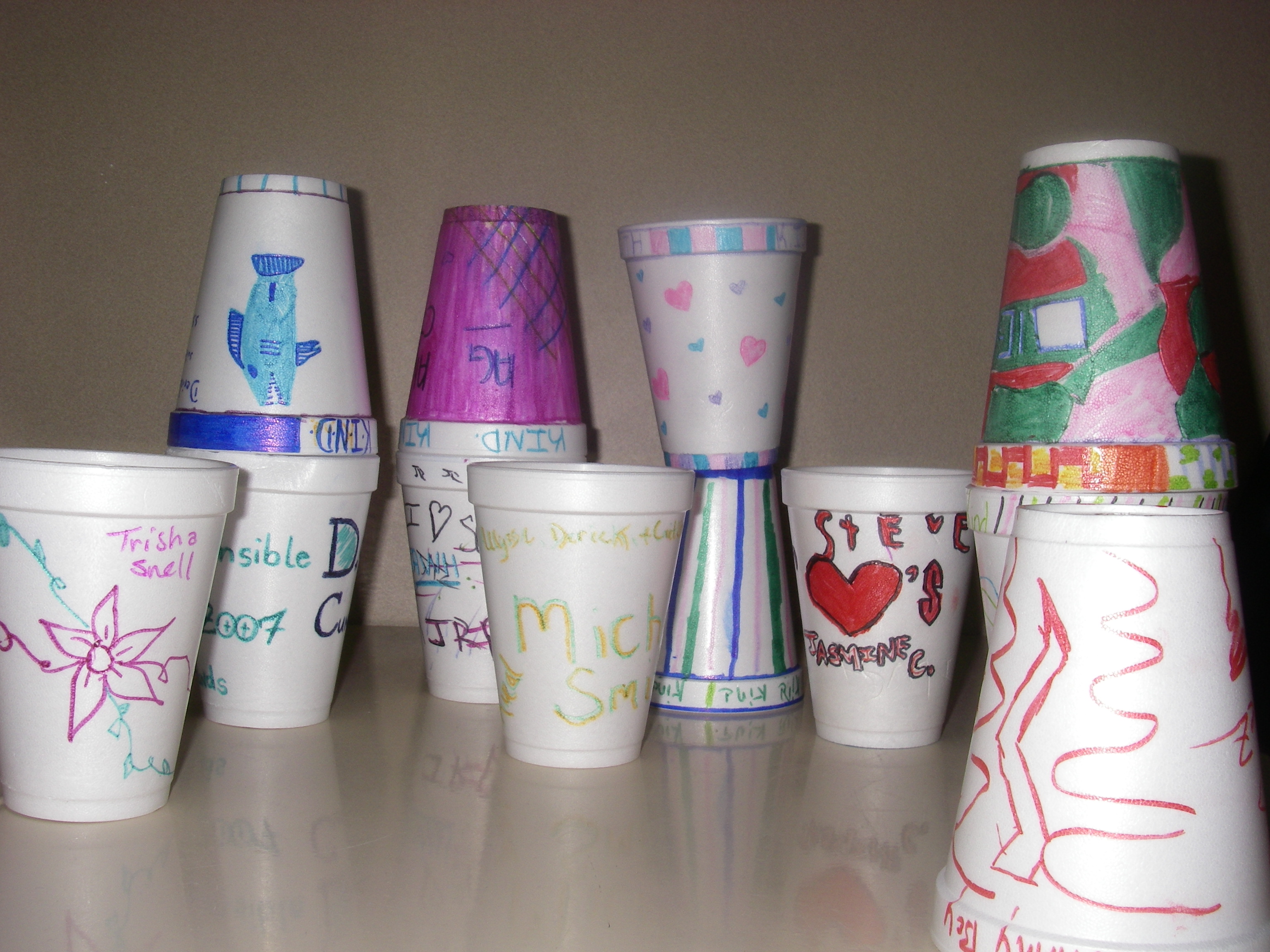 These styrofoam cups were decorated by students, and Robyn Staup brought them along on the Healy to be sunk deep into the Bering Sea (and brought back up again). Photo taken in Robyn Staup's berth in the USCGC Healy icebreaker, on the Bering Sea.