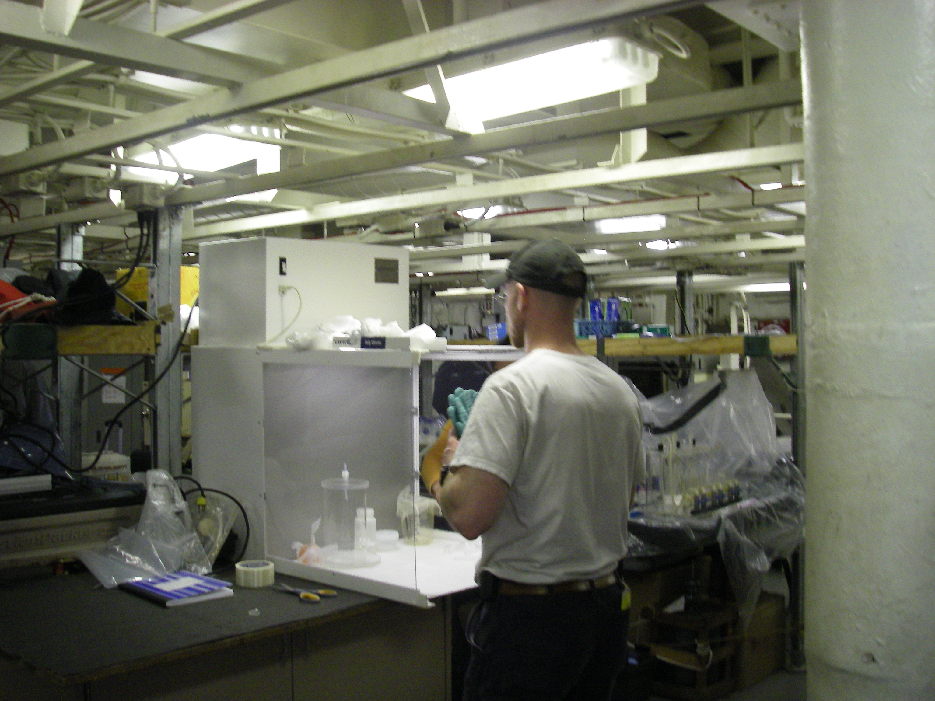 Rob works to put up a safe area that the water samples can be filtered. In the science lab of the USCGC Healy icebreaker, on the Bering Sea.