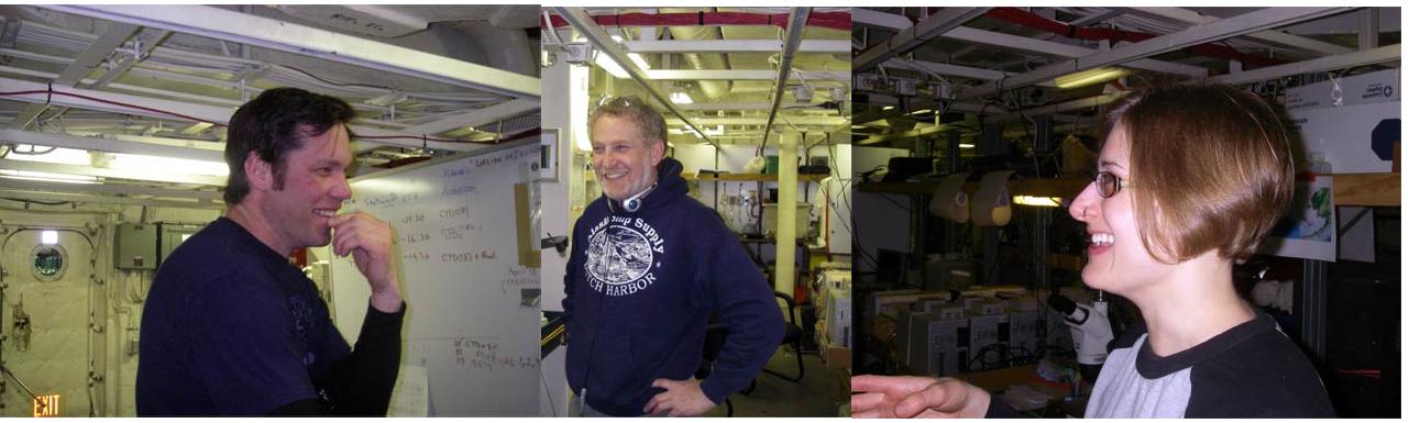 From left to right: Rob Freyer, Jeff Napp, and AJ LeFevre. Missing from the zoop crew shot: Brianna Blaud. In the science lab of the USCGC Healy icebreaker, on the Bering Sea.