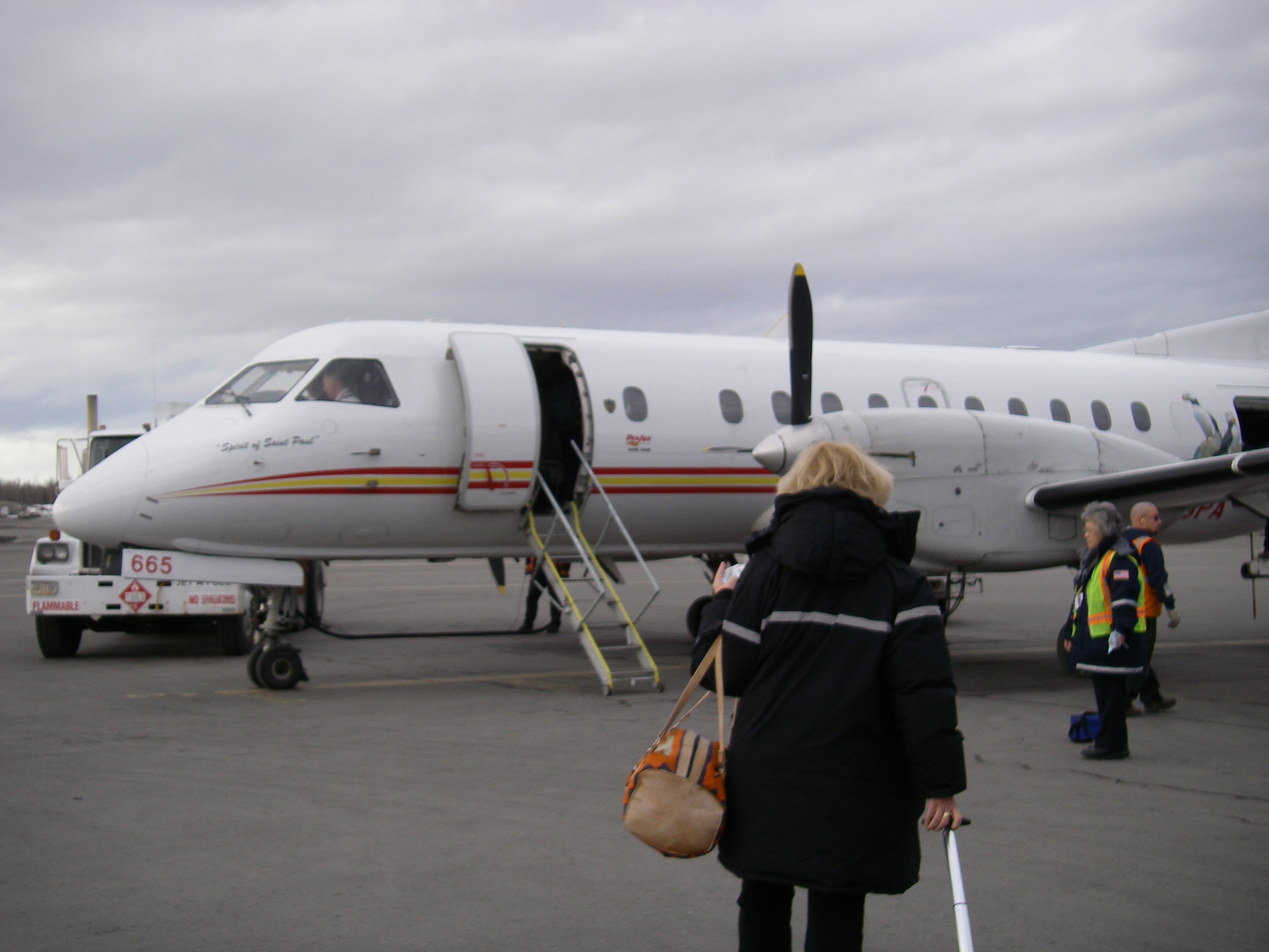 Maggie Prevenas boarding the SAAB plane destined for Dutch Harbor, at the airport in Anchorage, Alaska.