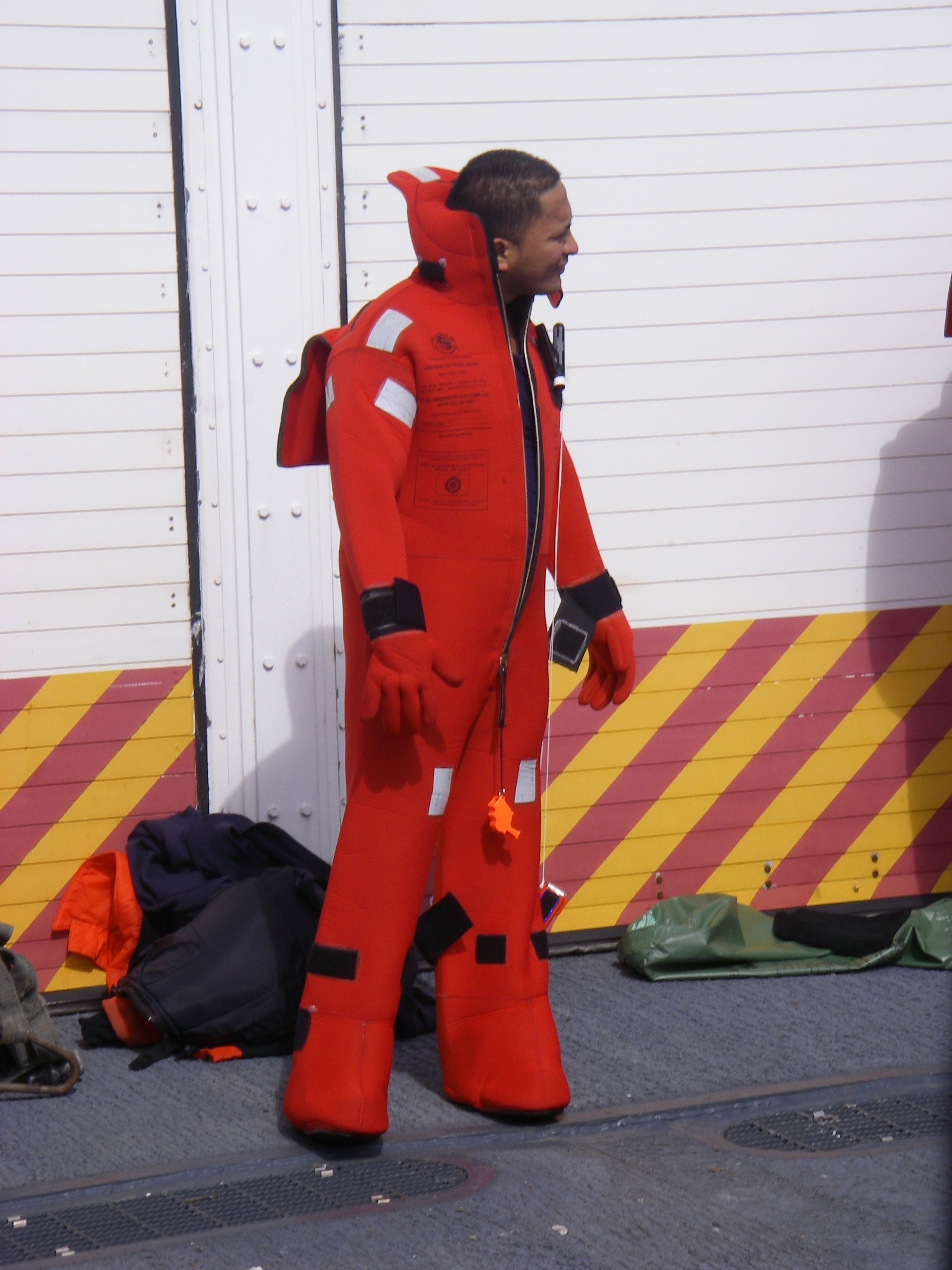 A Coast Guard volunteer puts on a survival suit that is too small, to show what *not* to do. On the flight deck of the USCGC Healy icebreaker, on the Bering Sea.