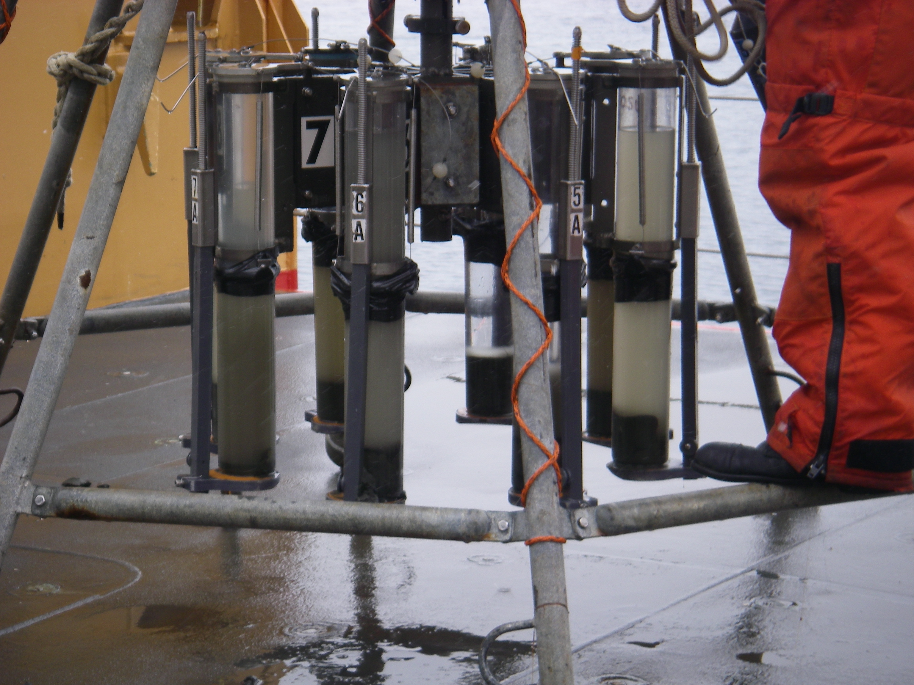 A bad core sample brought up to the station. Notice how there is hardly any mud in the sediment bottles. On the USCGC Healy icebreaker, on the Bering Sea.