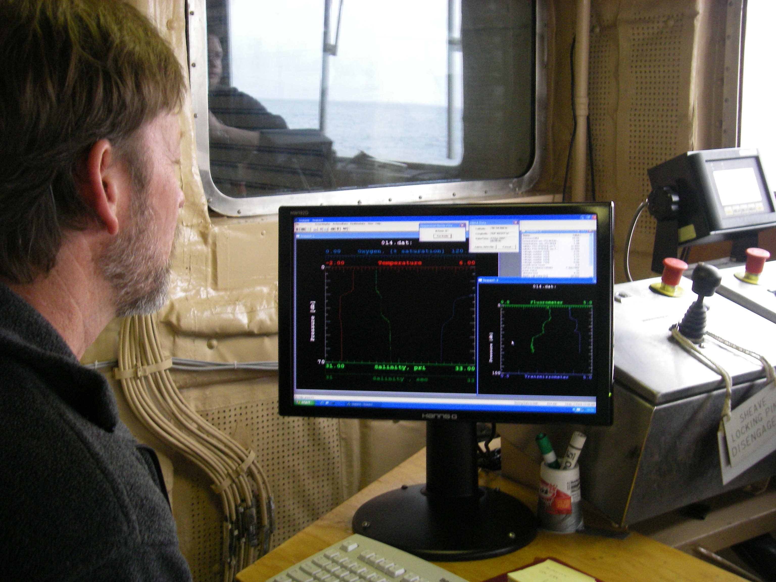 Scott Hiller looks over the data being collected by the CTD. On the USCGC Healy icebreaker, on the Bering Sea.
