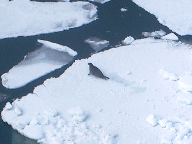 A Spotted Seal on an ice floe, as seen from a helicopter above the Bering Sea.