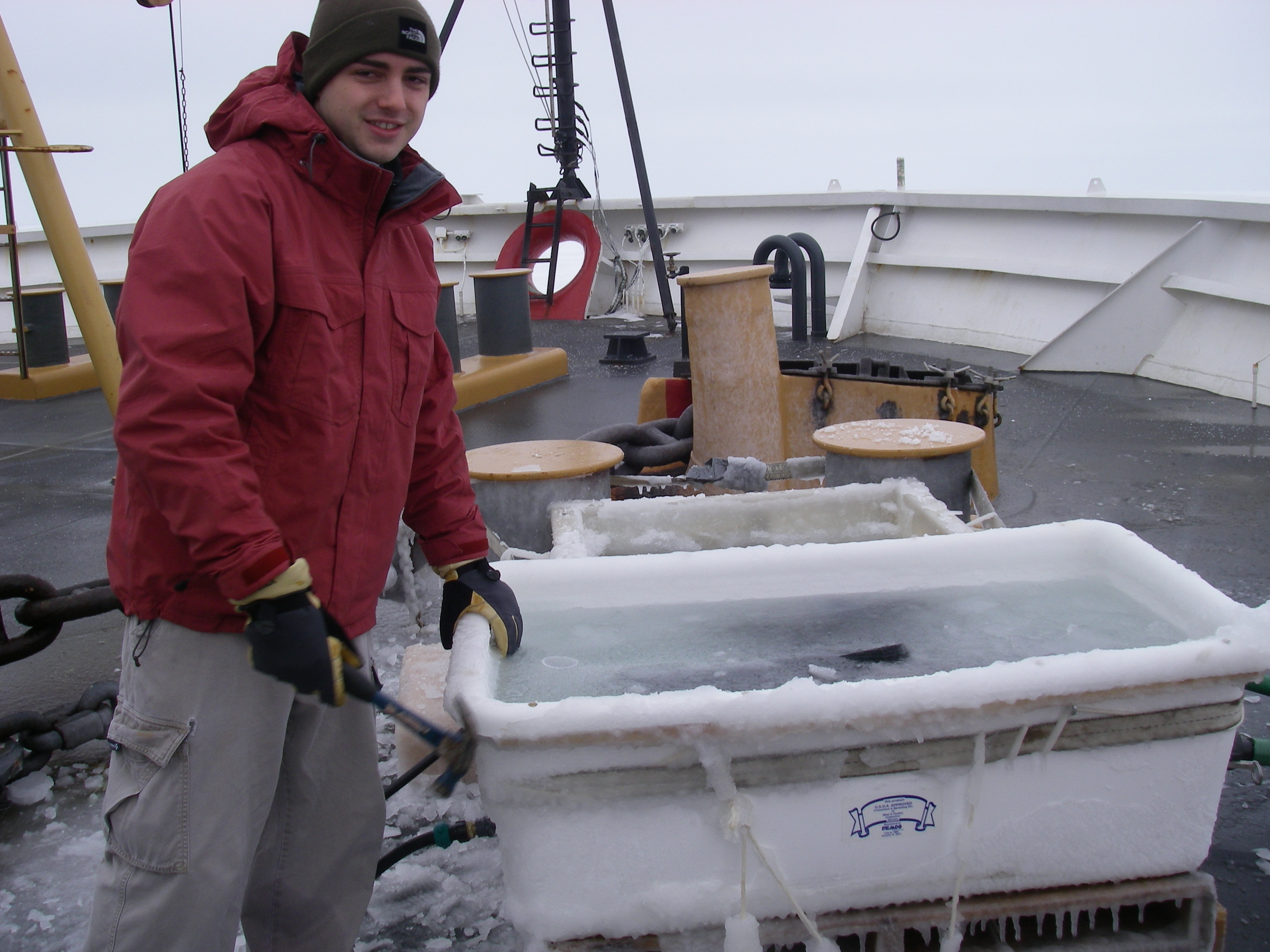 Kris Swenson working on getting through the frozen layer of the incubator to get the samples. Forward bow of the USCGC Healy icebreaker, on the Bering Sea.