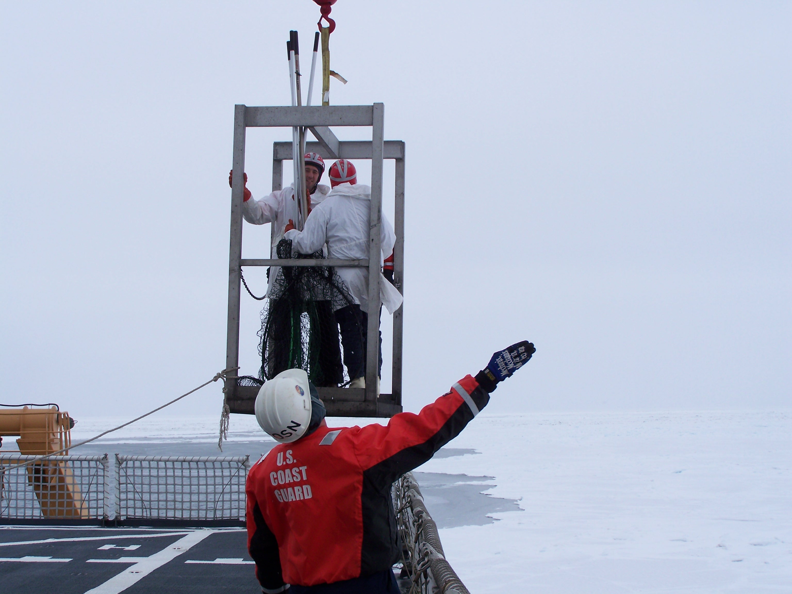 The seal group gets lowered onto the sea ice. On the USCGC Healy icebreaker, on the Bering Sea.