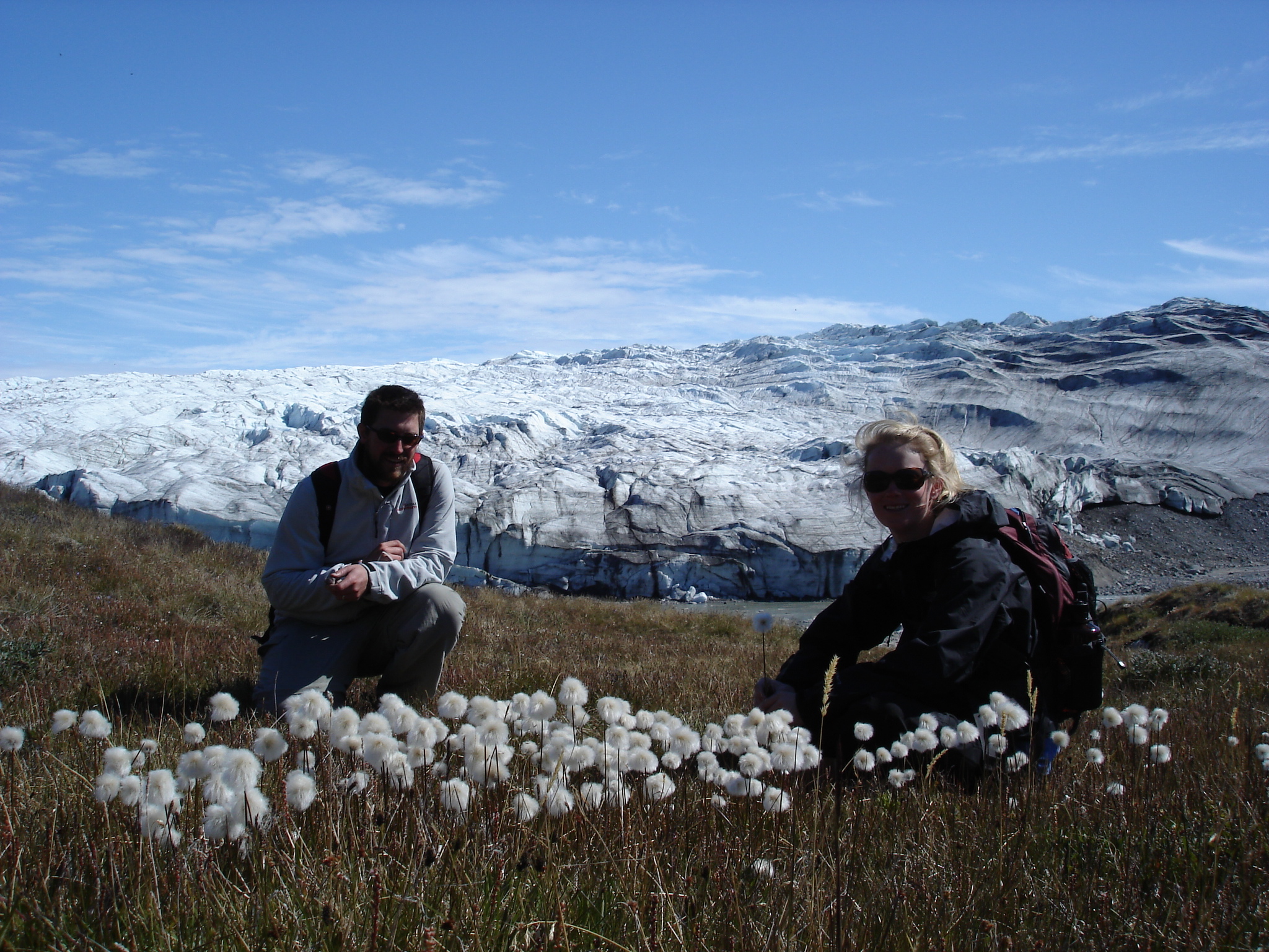 Christine, Jaque (not pictured), and Craig Beals take a break in the soft grass near the ice edge. Outside of Kangerlussuaq, Greenland.