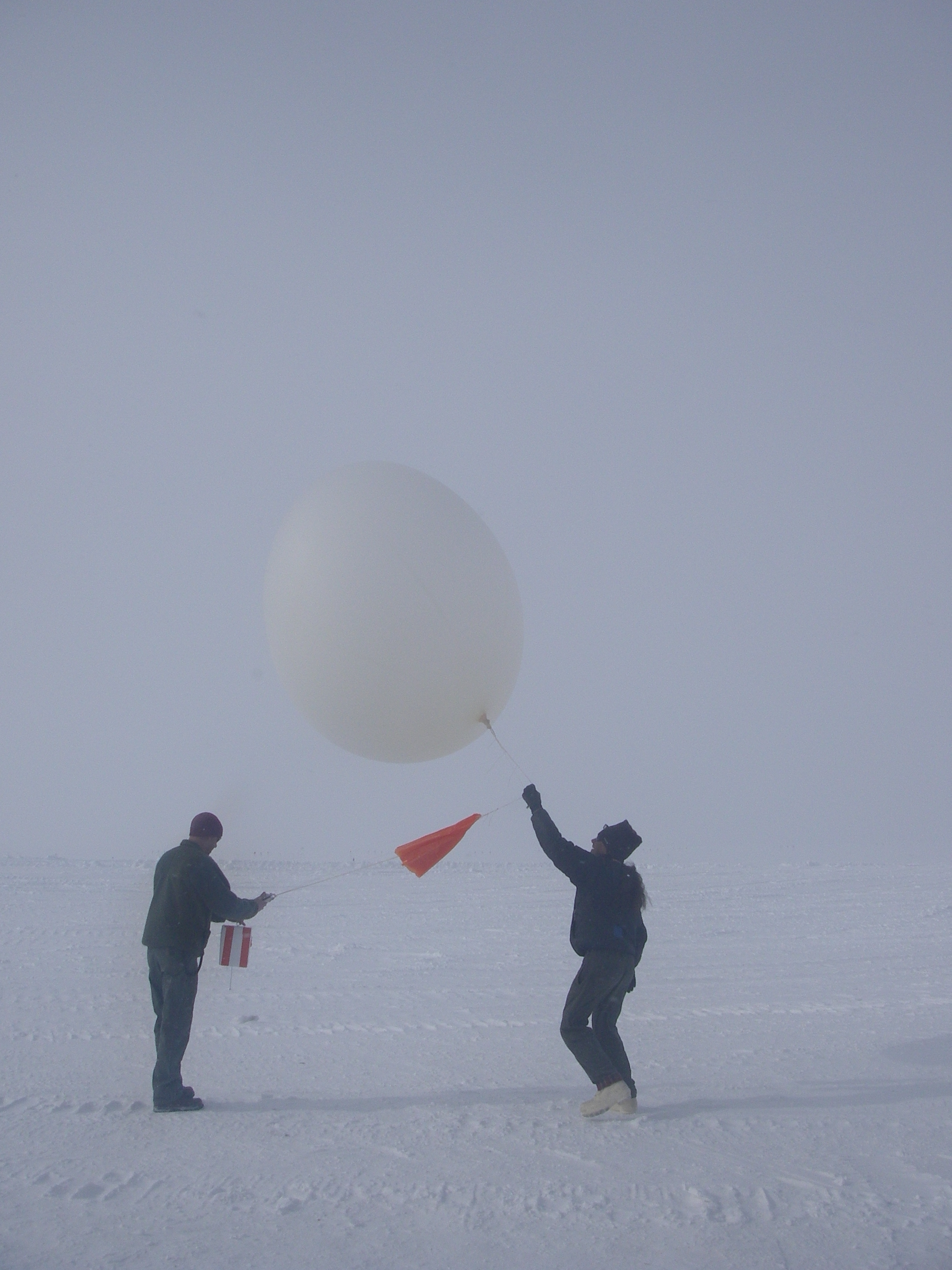 Science techs Steve and Andy launch a radiosonde weather balloon in snowy conditions and high wind. The balloon transmits back information about weather conditions from up high in the atmosphere before bursting and falling back to earth. Summit Camp, Greenland.