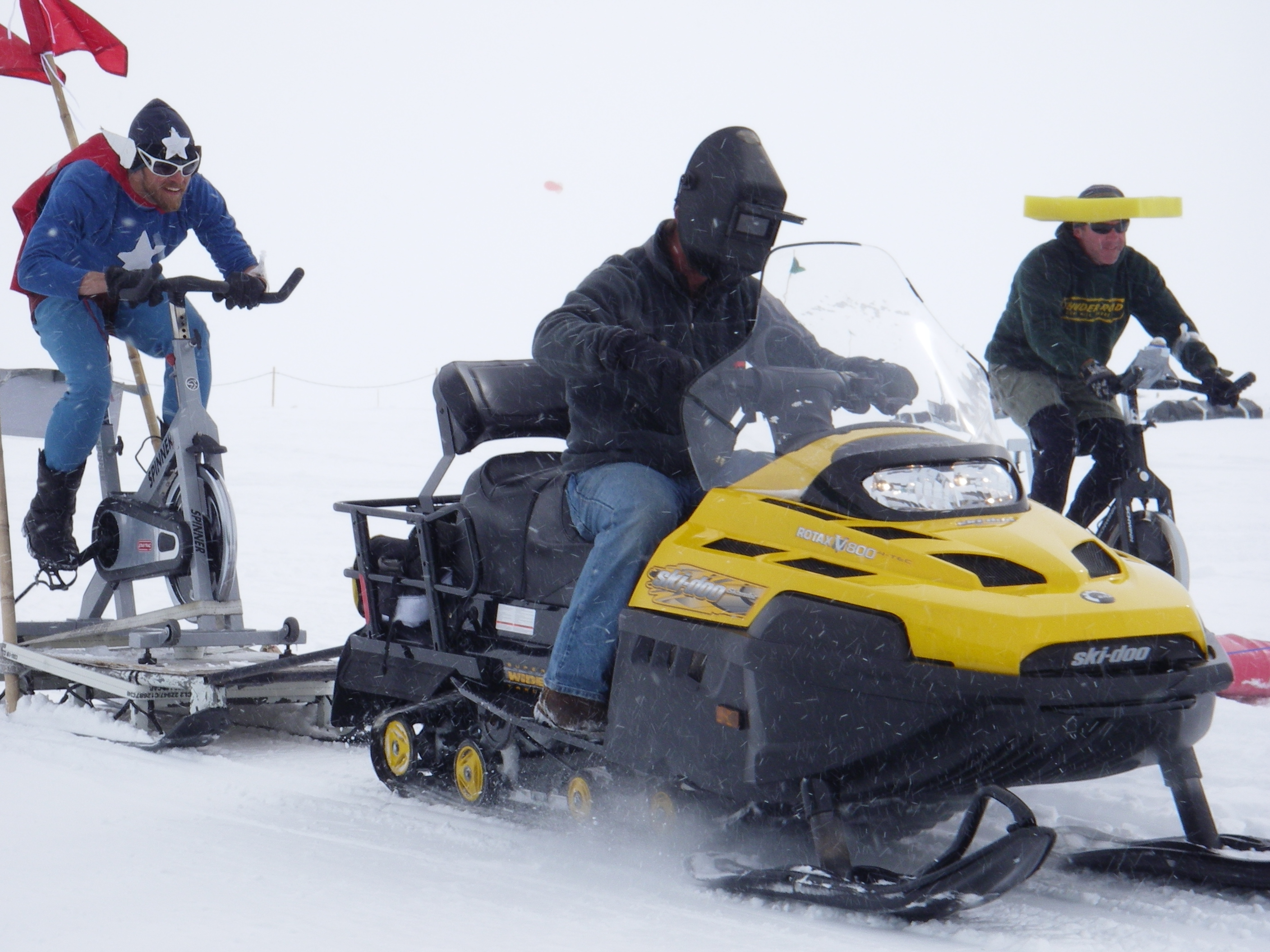 Faster than a speeding bullet… Ben (Machinery Operator) aka "Captain America" races past the competition on his exercise bike pulled by Chris the Medic! Summit Camp, Greenland.