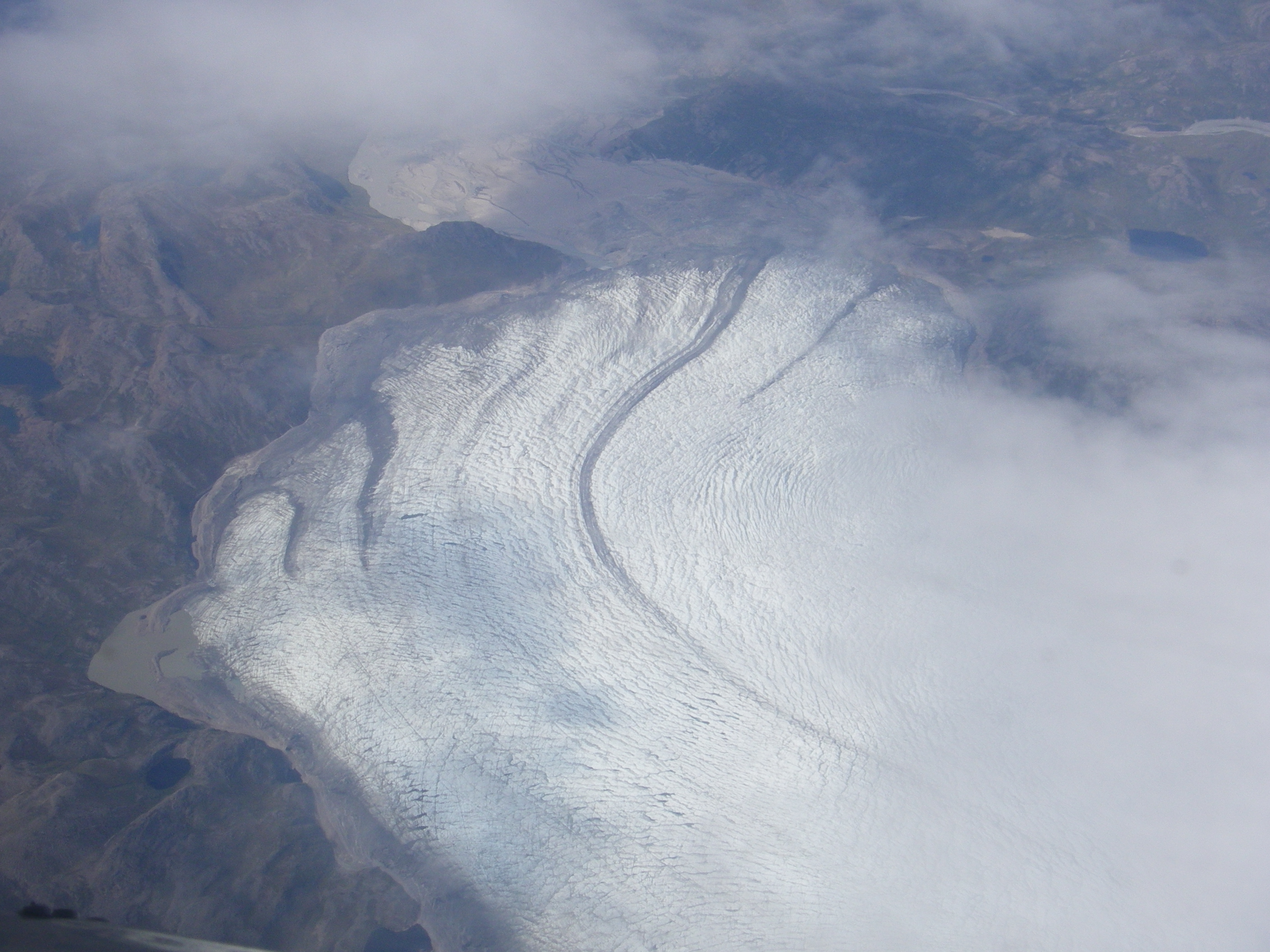 An ice edge glacier can be seen out the window of the C-130 Hercules, flying over Greenland.
