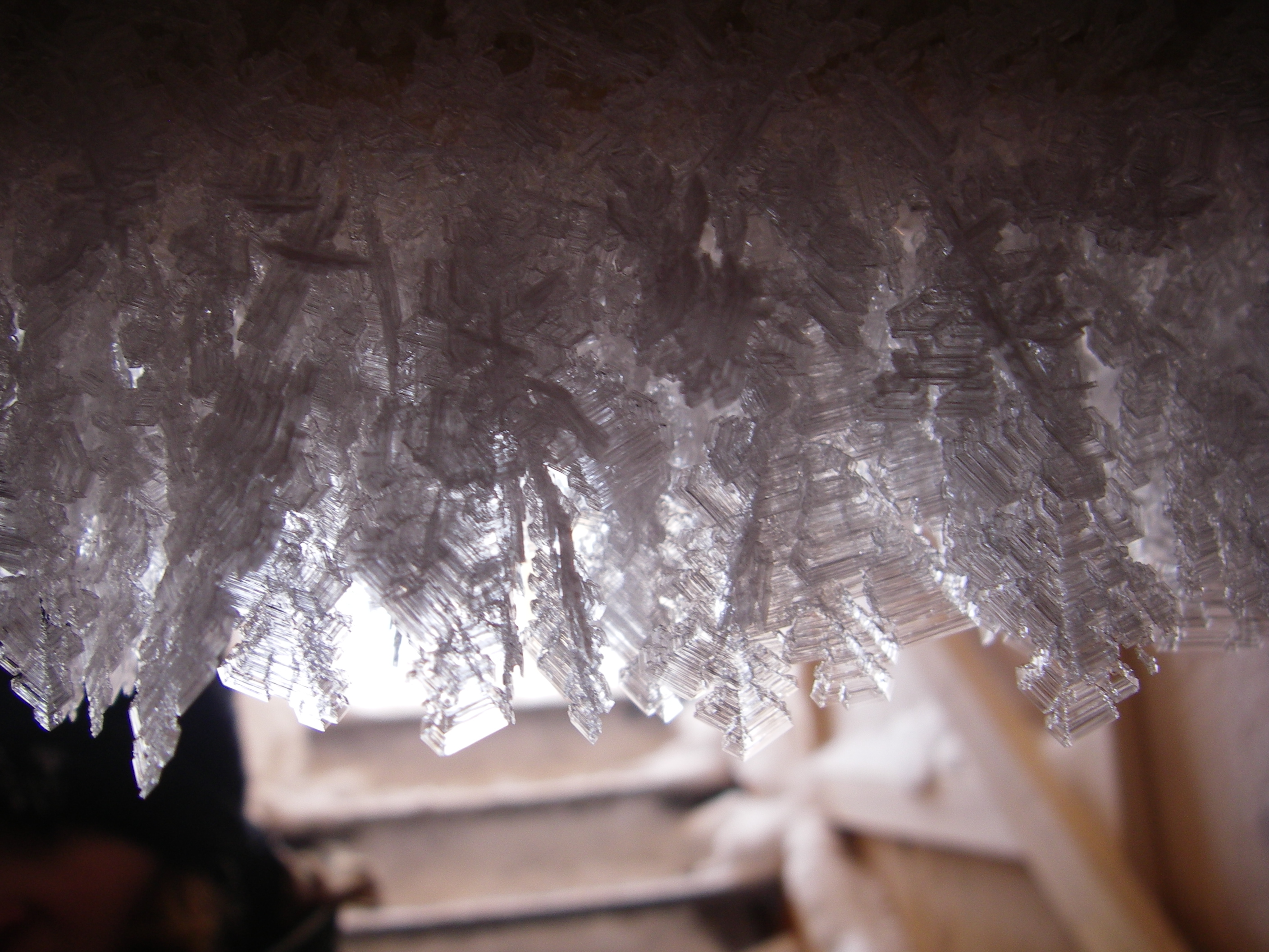 Outside air slowly drifts down into the underground freezer and carries moisture with it. Once inside the moisture can attach itself to the exposed ice and slowly create elaborate and beautiful ice crystals. Summit Camp, Greenland.