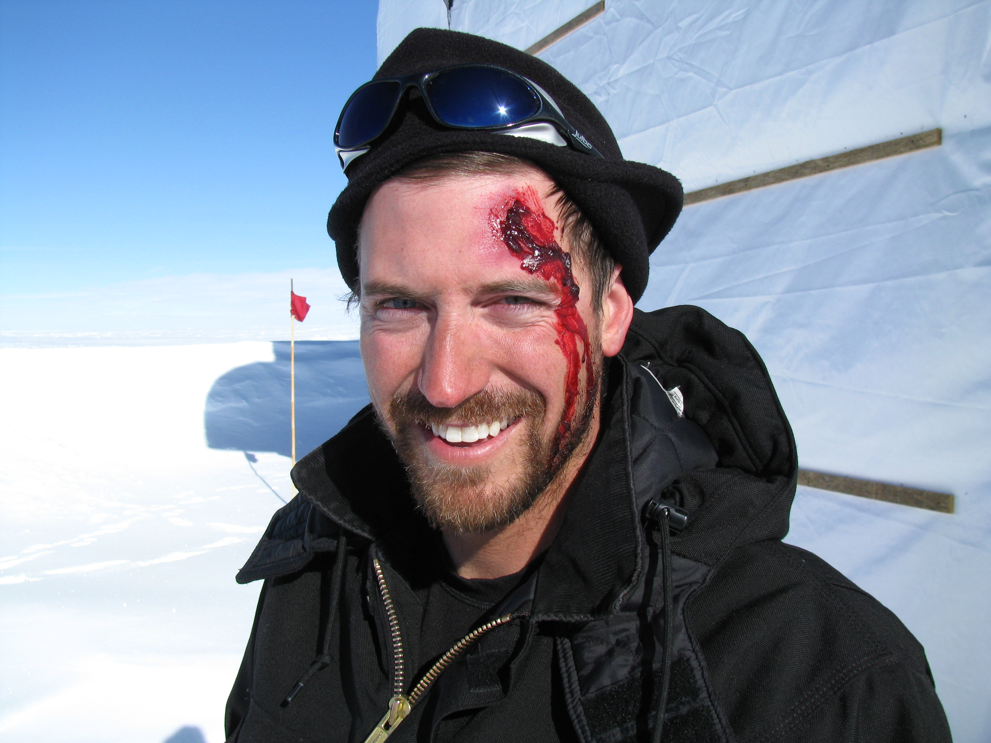 Chris the Medic got out his medical makeup and performed his handy work on my face to help make the training drill feel more authentic for the responders. Balloon Barn, Summit Camp, Greenland.