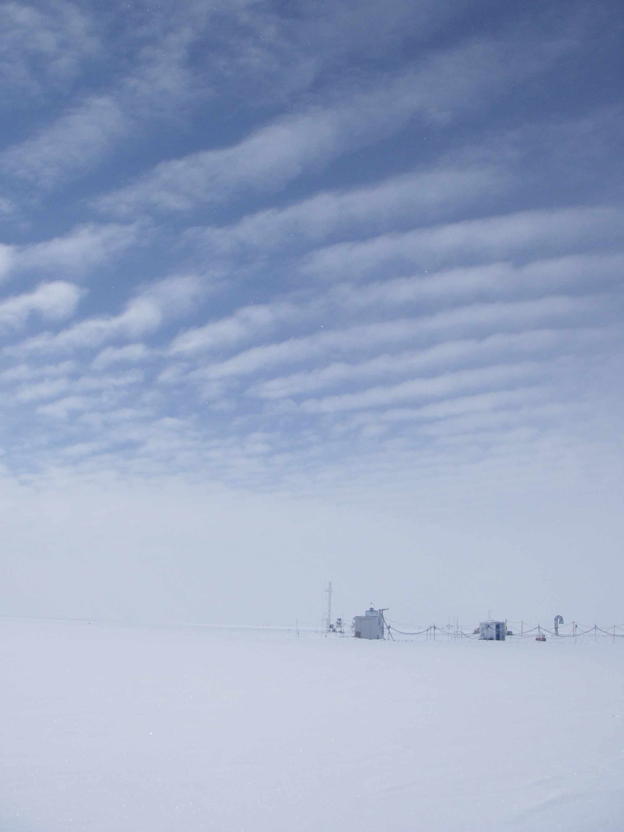 A view out across the Bally Building from Balloon Island. The clouds move in as the camp readies for the pending storm. Near the Bally Building, Summit Camp, Greenland.