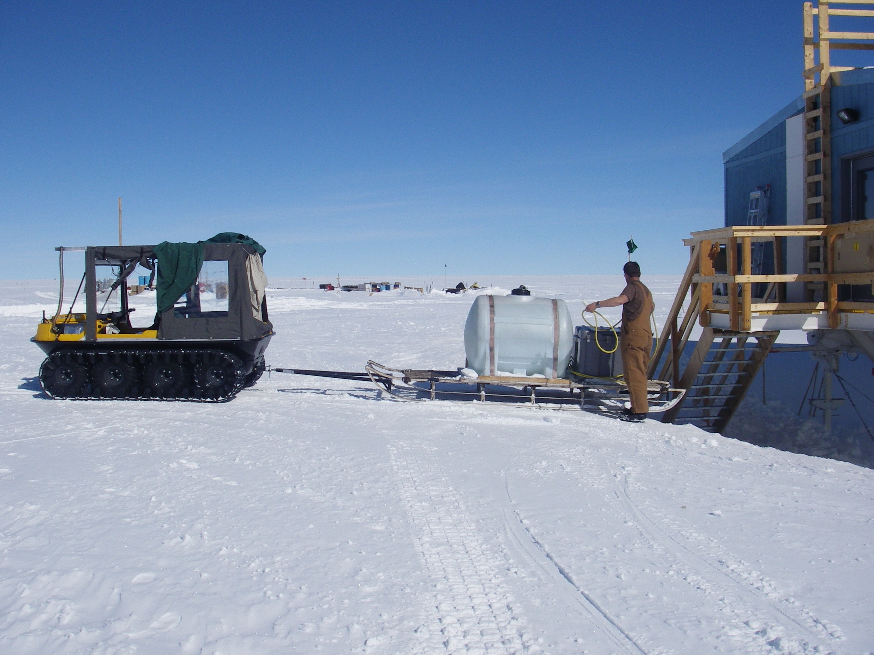 The portable water tank (called the "Pig") is pulled up to the Big House by Chris the Medic to fill the tank inside. The water is used for drinking, dishes, cooking, showers, and laundry. Outside the Big House, Summit Camp, Greenland.