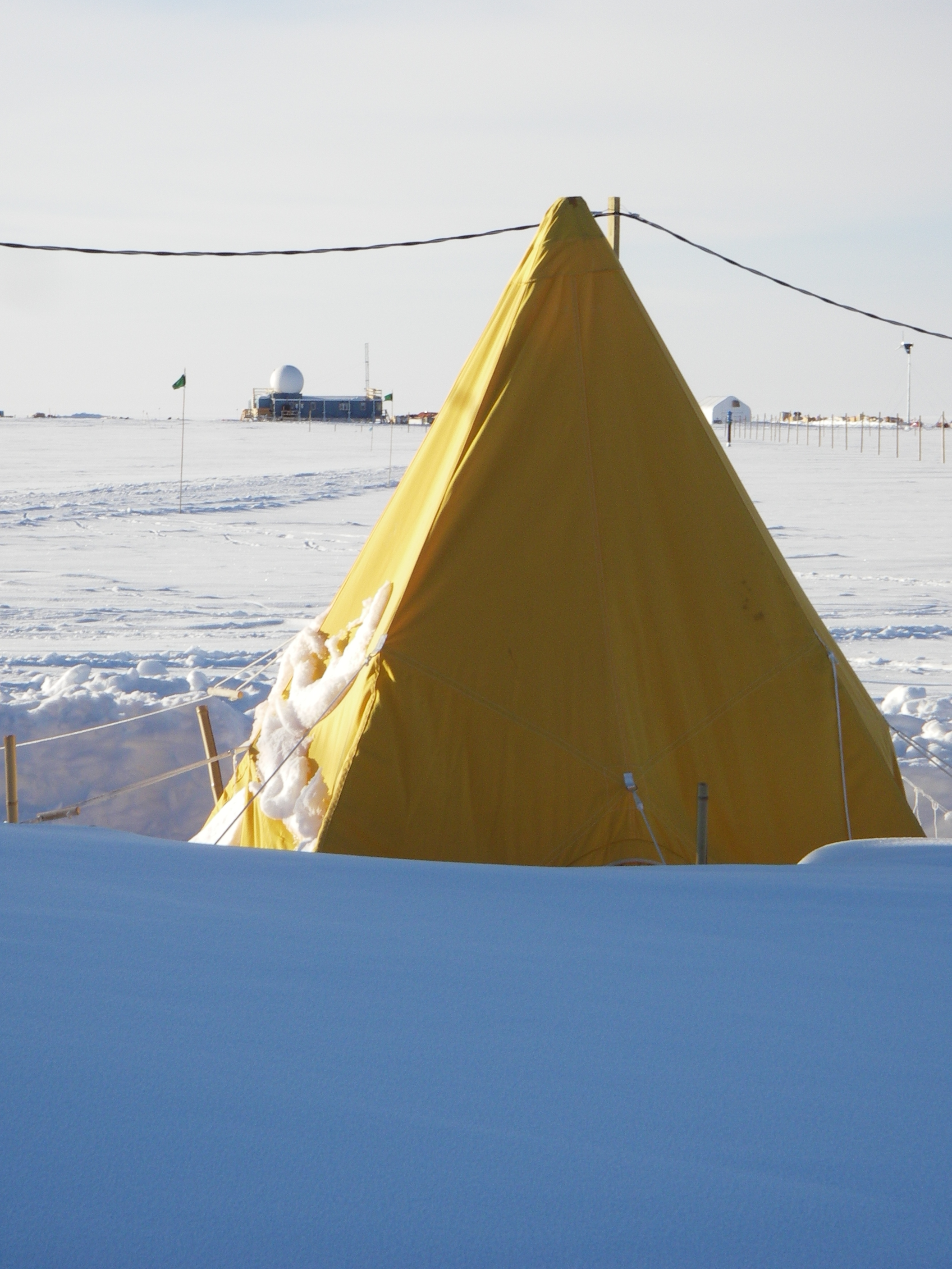 The outhouse at Satellite "Sat" Camp is a tent with a bucket. Procedure for use: Place plastic bag in bucket. Do job. Take bag out. Carry bag 1 km back to Summit Camp!