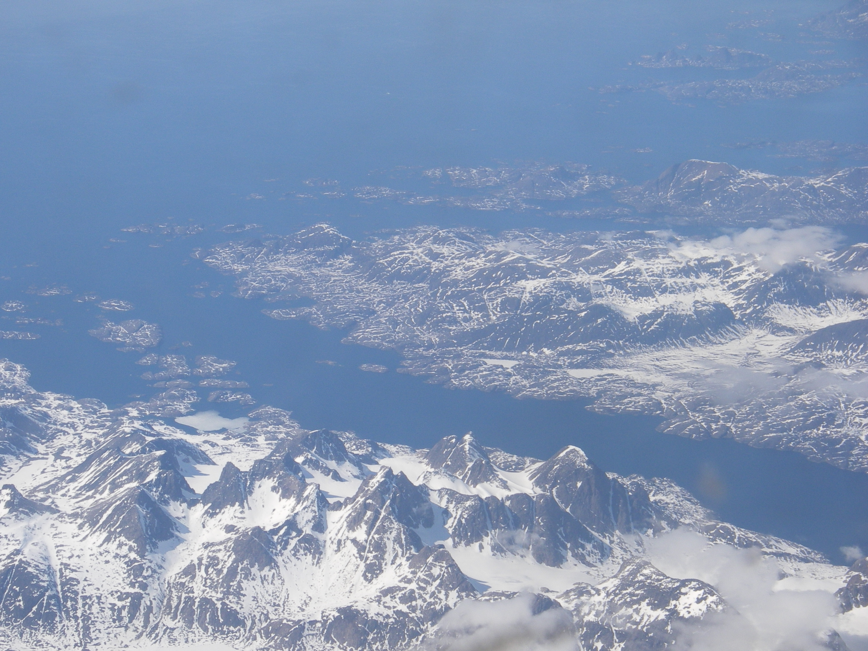 The coast of Greenland is littered with rock and ice. In a C-130 over Greenland.