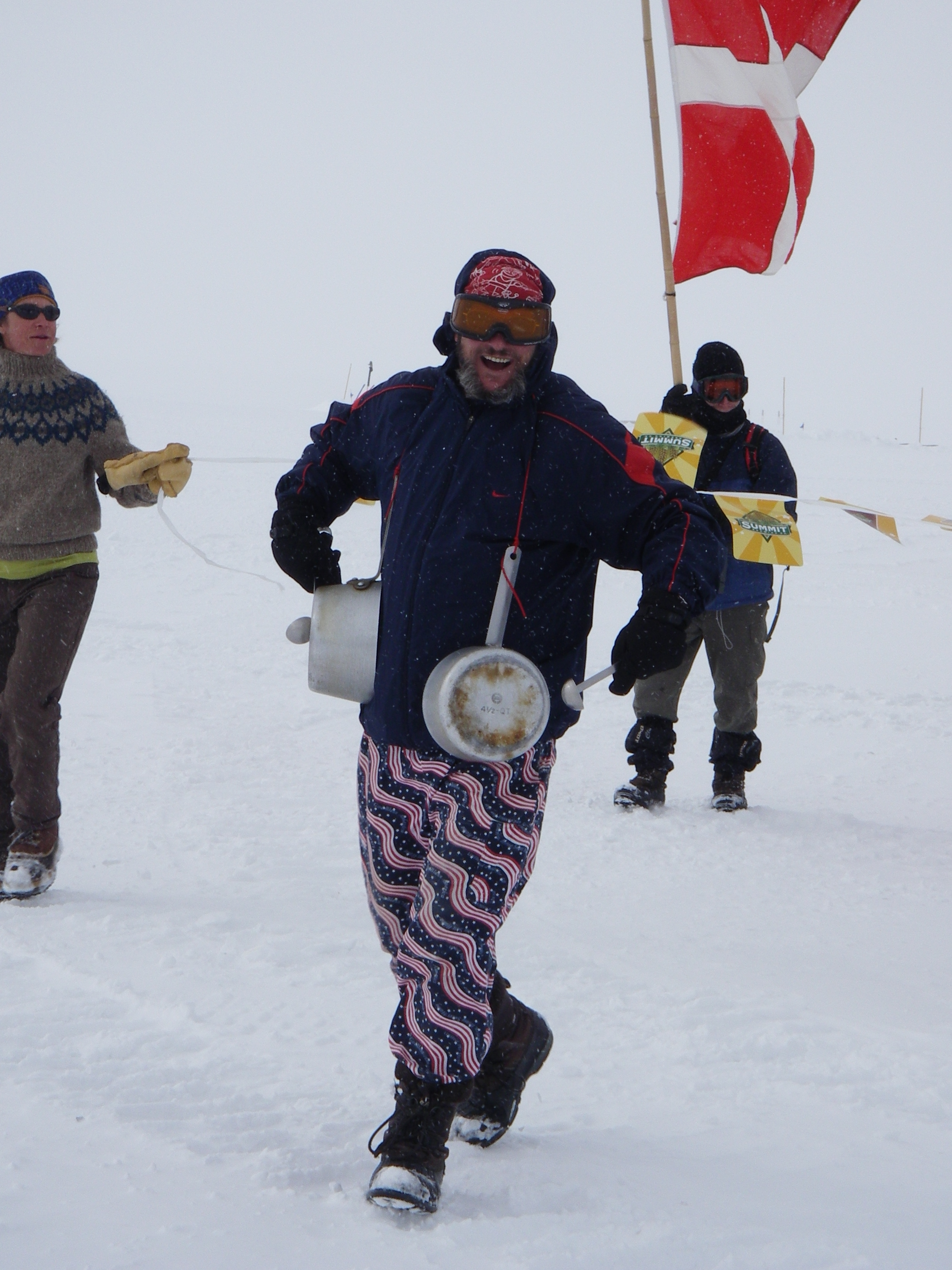 Will, the cook, leads the flag procession at the start of the 4th of July parade by banging his "drums" in perfect time! Summit Camp, Greenland.