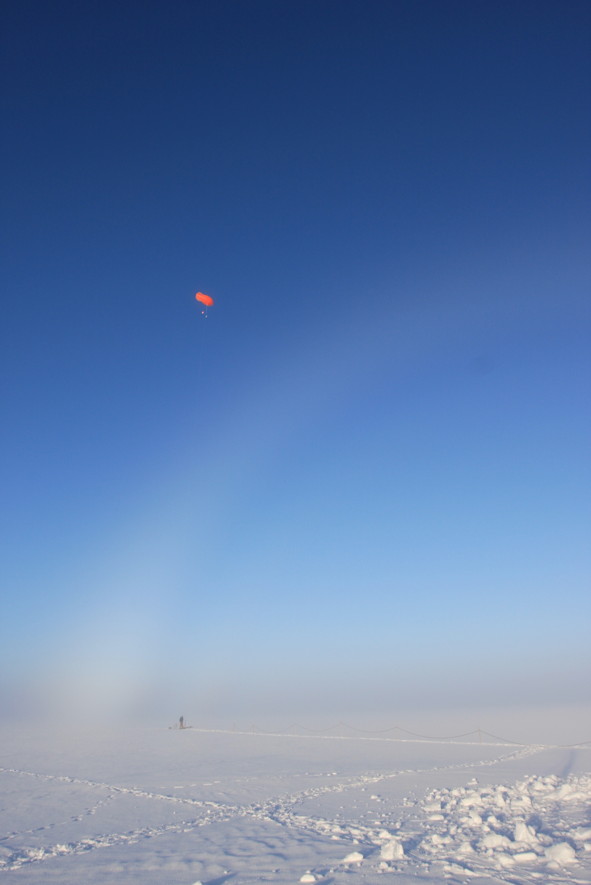 Last night during a blimp launch, we saw an impressive sight. It was a “fog bow” which is similar to a rainbow but is caused by fog and has no color bands, it is all white! If you look closely you can see the white band hovering over Craig Beals' head while he launches the tethersonde. Balloon Island, Greenland.
