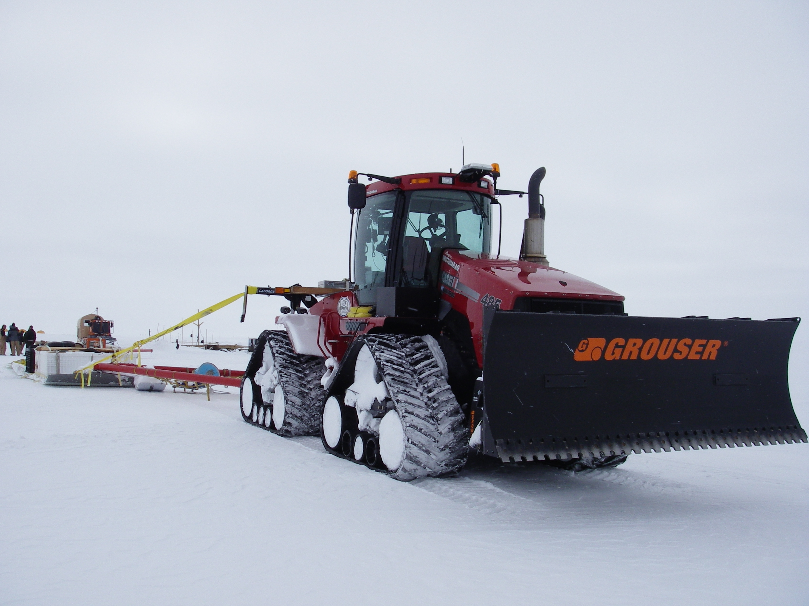 The CASE tractor has proved to be the most valuable piece of equipment on the traverse. With its powerful torque it can drag enough fuel and supplies to sustain the traverse through their journey. Machine Shop, Summit Camp, Greenland.