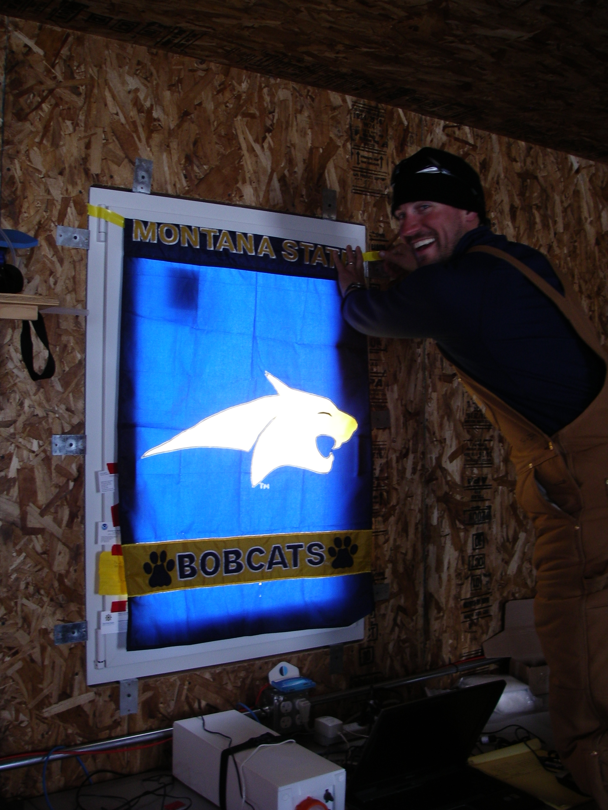 The sun shines 24 hours a day into the science lab. A Montana State University banner provides some darkness on an otherwise dark-less day at Satellite "Sat" Camp, Greenland.