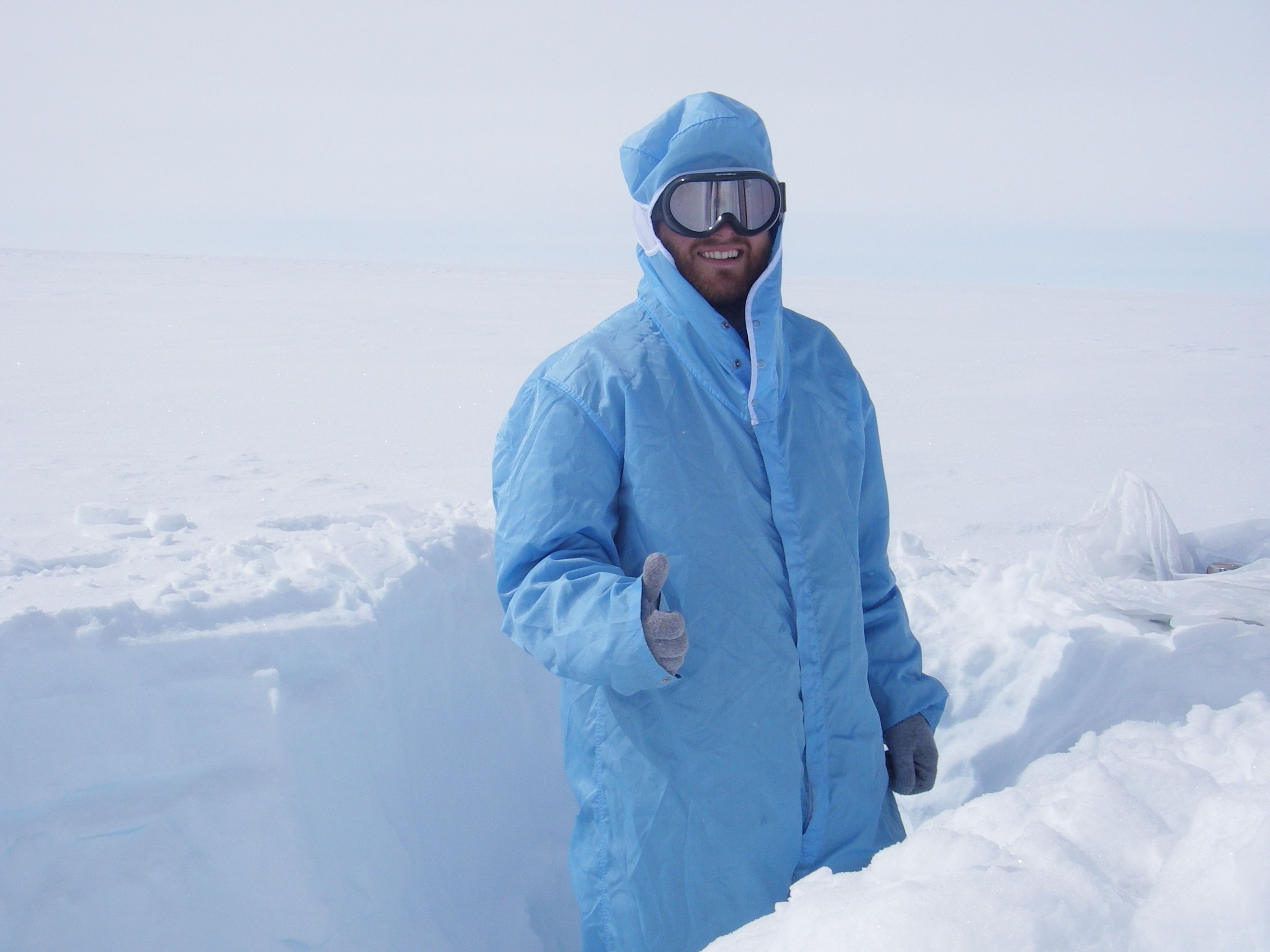 Luke Ziemba (Univ. of New Hampshire) prepares to take snow samples inside a snow pit. The blue "bunny" suit is worn so that his clothes and skin won't contaminate the snow. Balloon Island, Summit Camp, Greenland.